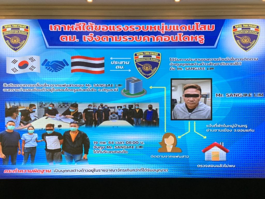 และยังแถลงจับ นาย SANGJAE อายุ 48 ปี หลังได้รับการประสานจากสถานทูตประเทศเกาหลีใต้ประจำประเทศไทยว่า มีบุคคลต่างด้าวสัญชาติเกาหลีชื่อ MR.SANGJAE เป็นที่ต้องการตัวของรัฐบาลเกาหลีใต้ เนื่องจากมีพฤติกรรมเกี่ยวข้องกับการลักลอบขนยาเสพติดระหว่างประเทศจากประเทศไทยไปเกาหลีใต้ ได้หลบหนีมาซ่อนตัวอยู่ในประเทศไทยก่อนเกิดการแพร่ระบาดของโรค โควิด-19 ซึ่งจากการตรวจสอบรายชื่อบุคคลดังกล่าวกับระบบสารสนเทศของสำนักงานตรวจคนเข้าเมือง หรือ ไบโอเมทริกซ์(Biometrics) ถึงทราบว่าบุคคลดังกล่าวมีที่พักอาศัยและมีการแจ้งพื้นที่พักอาศัยอยู่ในจังหวัดขอนแก่น ชุดสืบสวนจึงดำเนินการตรวจสอบทราบว่าเจ้าตัวพักอาศัยอยู่ภายในหมู่บ้านหรูแห่งหนึ่งย่านชานเมือง ขอนแก่น แต่เมื่อลงพื้นที่กลับไม่พบตัวเจ้าหน้าที่จึงสะกดรอยติดตามความเคลื่อนไหวของแฟนสาว กระทั่งทราบว่าบุคคลต่างด้าวรายนี้มีที่พักอยู่หลายแห่ง และทราบอีกว่าเจ้าตัวได้เดินทางไปซ่อนตัวอยู่ในคอนโดหรูแห่งหนึ่งในอำเภอคลองหลวง จังหวัดปทุมธานี จึงวางแผนเข้าจับกุม ตรวจสอบ กับระบบไบโอเมทริกซ์ พบว่า นาย SANGJAE เป็นบุคคลต่างด้าวอยู่เกินกำหนด (Overstay) จำนวน 294 วัน จึงแจ้งข้อหาเป็นบุคคลต่างด้าวอยู่ในราชอาณาจักรเกินกว่าที่ได้รับอนุญาต พร้อมนำส่งพนักงานสอบสวนดำเนินคดีตามกฎหมายและแจ้งสถานทูตประเทศเกาหลีใต้ประจำประเทศไทยเพื่อดำเนินการในส่วนที่เกี่ยวข้องต่อไป.-สำนักข่าวไทย