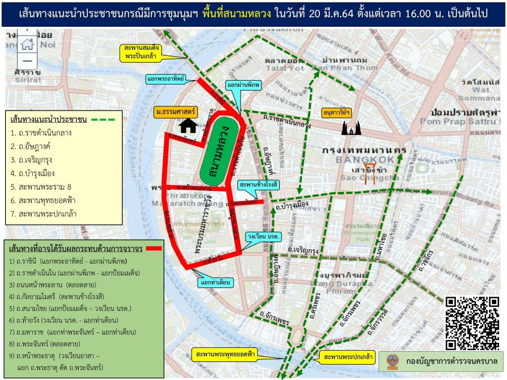 ส่วนมาตรการรับสถานการณ์การผู้ชุมนุม ช่วงเช้าจะยังไม่มีการวางสิ่งกีดขวางปิดการจราจร แต่ในช่วงเย็นที่จะมีการชุมนุม เจ้าหน้าที่จะประเมินตามสถานการณ์อีกครั้ง จึงขอให้ประชาชนหลีกเลี่ยงเส้นทางโดยรอบสนามหลวงตั้งแต่เวลา 16.00 น. เป็นต้นไป