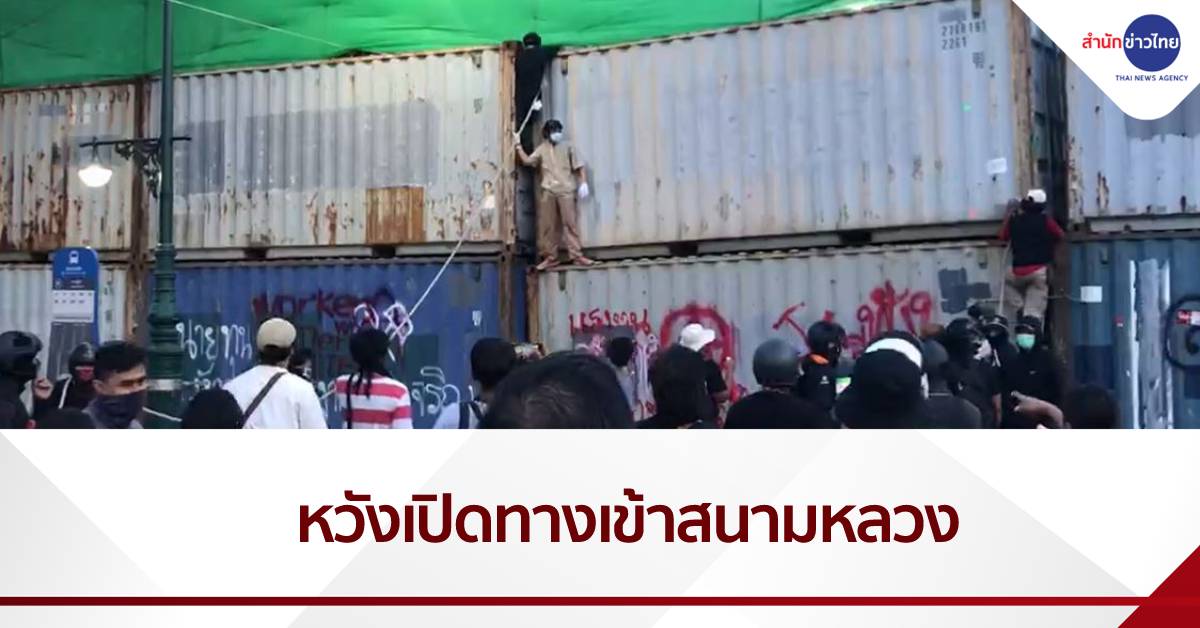 เมื่อเวลา 18.25 น. วันที่ 20 มีนาคม ที่ถนนราชดำเนินใน ผู้สื่อข่าวรายงานบรรยากาศการชุมนุมของกลุ่มรีเด็ม ซึ่งนัดหมายที่ท้องสนามหลวง โดยเจ้าหน้าที่ได้วางสิ่งกีดขวางเป็นตู้คอนเทนเนอร์สูง 2 ชั้น พร้อมขึงตาข่ายไนล่อนเป็นแนวยาวตั้งแต่ฝั่งศาลฏีกา ฝ่ากลางสนามหลวงไปถึงมหาวิทยาลัยธรรมศาสตร์ ท่าพระจันทร์ ทำให้ผู้ชุมนุมไม่สามารถข้ามทะลุไปถึงพื้นที่สนามหลวงได้ ก่อนที่ผู้ชุมนุมบางส่วนพยายามปีนป่ายขึ้นไปผูกเชือกบนตู้คอนเทนเนอร์ และพยายามช่วยกันดึงลงมา ซึ่งทำให้ตู้ชั้นบนขยับออกมาไ แต่ยังไม่ร่วง