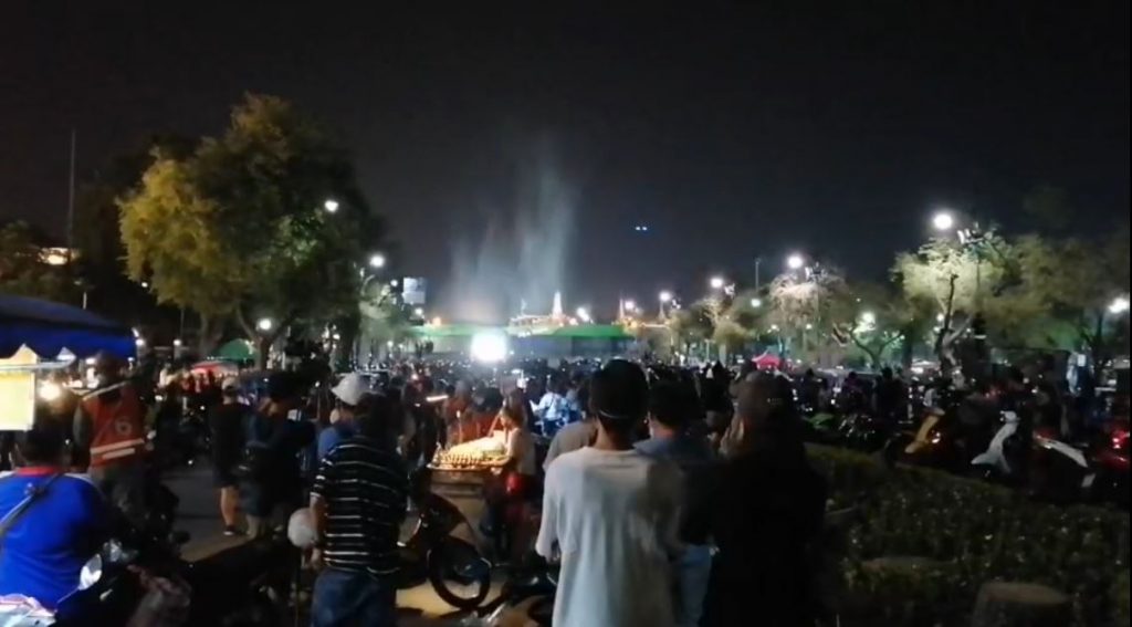 ส่วนบริเวณสี่แยกคอกวัว ถนนราชดำเนินกลาง เกิดเหตุชุลมุนขึ้น เมื่อกลุ่มผู้ชุมนุม REDEM ส่วนหนึ่งที่ถอยจากเชิงสะพานพระปิ่นเกล้า กลับไปรวมตัวกัน และเริ่มมีการเผาทำลายทรัพย์สิน ส่งผลให้ต้องโยกกำลังเจ้าหน้าที่ควบคุมฝูงชนเข้าเตรียมสลายการชุมนุม พร้อมนำรถฉีดน้ำแรงดันสูงเข้าไปประชิด แต่ถูกตอบโต้จากมวลชนด้วยการขว้างปาวัตถุเสียงดังคล้ายระเบิดเข้าใส่ตำรวจอย่างต่อเนื่อง. – สำนักข่าวไทย