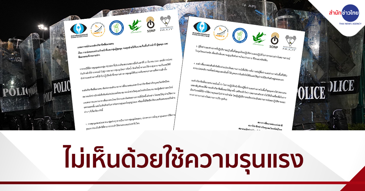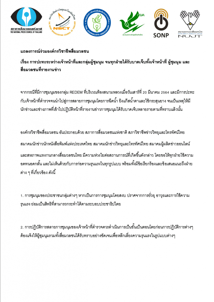 กรุงเทพฯ 21 มี.ค.-6 องค์กรวิชาชีพสื่อ แถลงการณ์เหตุชุมนุม #ม็อบ20มีนา ขอทุกฝ่ายใช้ความอดทนอดกลั้น ไม่เห็นด้วยกับการก่อความรุนแรงทุกรูปแบบ
