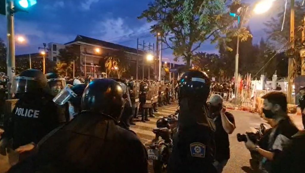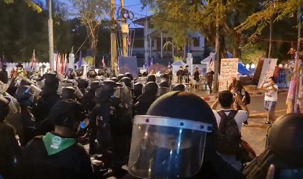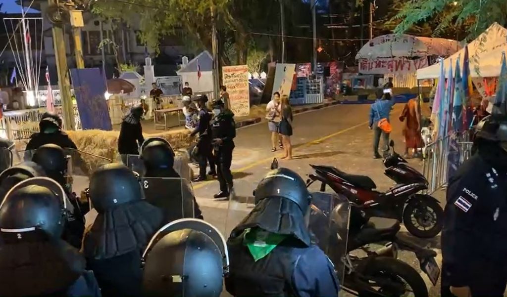 ผู้ชุมนุมที่อยู่ภายในหมู่บ้านทะลุฟ้าบนถนนพระราม 5 หน้าทำเนียบรัฐบาล เผยแพร่เหตุการณ์ผ่านเพจเฟซบุ๊ก ขณะที่ตำรวจควบคุมฝูงชนกำลังพล 3 กองร้อย เข้ากระชับขอคืนพื้นที่พร้อมประกาศให้รื้อถอนสิ่งปลูกสร้างหรือสิ่งกีดขวางเส้นทางการจราจร ออกจากพื้นที่ภายใน 3 นาที ตัวแทนผู้ชุมนุมต่อรองขอเวลาเพิ่มเพราะมีสัมภาระจำนวนมาก ไม่สามารถเคลื่อนย้ายออกไปได้ภายใน 3 นาที แต่ตำรวจไม่ยินยอมและเคลื่อนกำลังพลเข้ากระชับพื้นที่ทันที โดยจัดกำลังพลปิดหัว – ท้าย บน ถนนพระรามที่ 5 เรียบคลองผดุงกรุงเกษม จากเชิงสะพานชมัยมรุเชฐไปจนถึงสะพานอรทัย