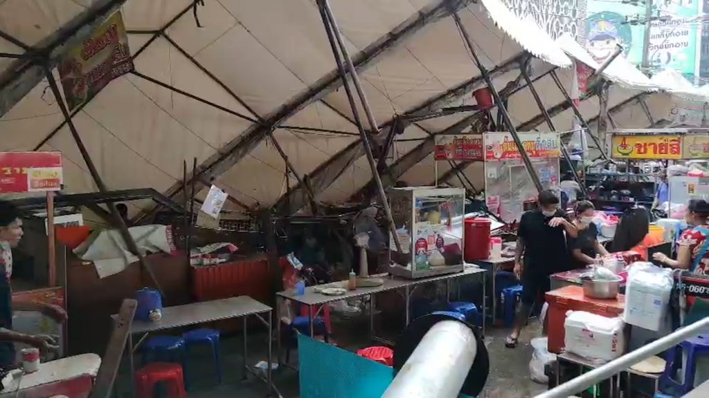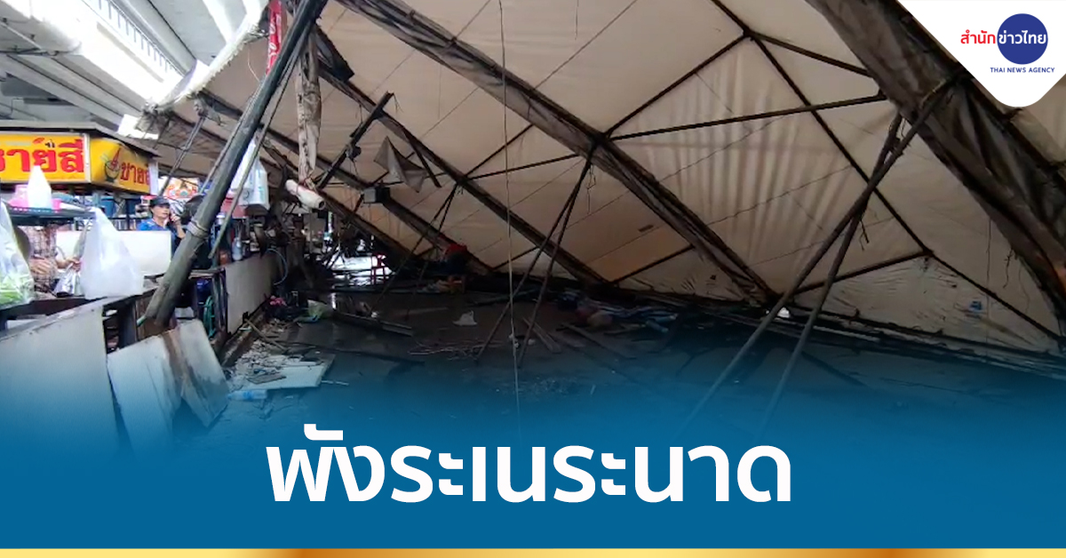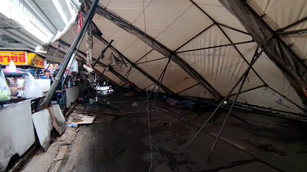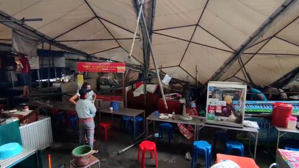กรุงเทพฯ 4 เม.ย.-ฝนถล่มลมแรง! เต็นท์ร้านค้าตลาดใหม่ดอนเมือง ล้มพังระเนระนาด เจ้าที่ต้องปิดการจราจรชั่วคราว พ่อค้าแม่ค้าเก็บของกลับบ้าน หวั่นไม่ปลอดภัย