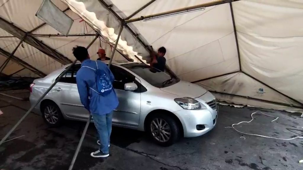 น.ส.กฤษณิน จันทร์ แสนโรจน์ เจ้าของรถกล่าวว่า ก่อนเกิดเหตุระหว่างที่ตนกำลังขับมาตามถนนเชิดวุฒากาศ ซึ่งขณะนั้นมีฝนตกลงมาอย่างหนัก และลมแรง จู่ๆ เห็นเต็นท์ยกลอยตัวออกมากลางถนนตนพยายามหักหลบแต่ไม่พ้นถูกเต็นท์ล้มทับหลังคาได้รับความเสียหาย