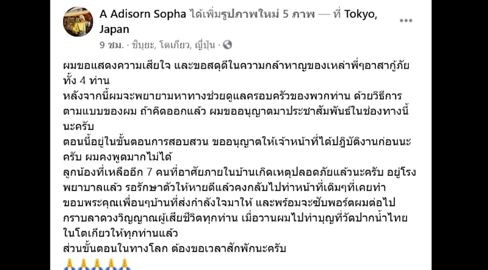 ขณะที่นายอดิสรณ์ โสภา หรือ เอ มินเนี่ยน เจ้าของบ้านที่เกิดเหตุไฟไหม้ โพสต์เฟชบุ๊กว่า “ผมขอแสดงความเสียใจ และขอสุดุดีในความกล้าหาญของเหล่าพี่ๆ อาสากู้ภัยทั้ง 4 ท่าน หลังจากนี้ผมจะพยายามหาทางช่วยดูแลครอบครัวของพวกท่านด้วยวิธีการตามแบบของผม ถ้าคิดออกแล้ว ผมขออนุญาตมาประชาสัมพันธ์ในช่องทางนี้นะครับ ตอนนี้อยู่ในขั้นตอนการสอบสวน ขออนุญาตให้เจ้าหน้าที่ได้ปฏิบัติงานก่อนนะครับ ผมคงพูดมากไม่ได้ ลูกน้องที่เหลืออีก 7 คนที่อาศัยภายในบ้านเกิดเหตุปลอดภัยแล้วนะครับ อยู่โรงพยาบาลแล้ว รอรักษาตัวให้หายดีแล้วคงกลับไปทำหน้าที่เดิมๆ ที่เคยทำ ขอบพระคุณเพื่อนๆ บ้านที่ส่งกำลังใจมาให้ และพร้อมจะซัพพอร์ตผมต่อไป กราบลาดวงวิญญาณผู้เสียชีวิตทุกท่าน เมื่อวานผมไปทำบุญที่วัดปากน้ำไทยในโตเกียวให้ทุกส่วนชั้นตอนในทางโลก ต้องขอเวลาสักพักนะครับ”.-สำนักข่าวไทย