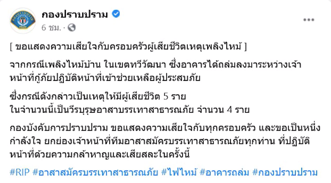 ด้านเฟซบุ๊ก กองปราบปราม โพสต์รูปและข้อความส่งความเสียใจไปยังครอบครัวของอาสมัครกู้ภัยที่เสียชีวิต โดยระบุว่าจากกรณีเพลิงไหม้บ้านในเขตทวีวัฒนา ซึ่งอาคารถล่มลงมาระหว่างเจ้าหน้าที่กู้ภัย ปฏิบัติหน้าที่เข้าช่วยเหลือผู้ประสบภัย กรณีดังกล่าวเป็นเหตุให้มีผู้เสียชีวิต 5 คน ในจำนวนนี้เป็นวีรบุรุษอาสาบรรเทาสาธารณภัย จำนวน 4 คน กองบังคับการปราบปราม ขอแสดงความเสียใจกับทุกครอบครัว และขอเป็นหนึ่งกำลังใจ ยกย่องเจ้าหน้าที่ทีมอาสาสมัครบรรเทาสาธารณภัยทุกท่าน ที่ปฏิบัติหน้าที่ด้วยความกล้าหาญและเสียสละในครั้งนี้