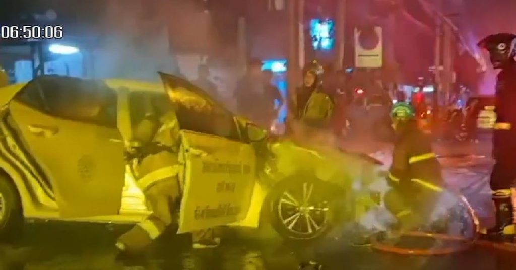 กรุงเทพฯ 8 เม.ย. – ไฟลุกไหม้ห้องเครื่องแท็กซี่ บริเวณปากซอยเอกชัย 66/3 โชเฟอร์พาผู้โดยสารหนีตายหวุดหวิด