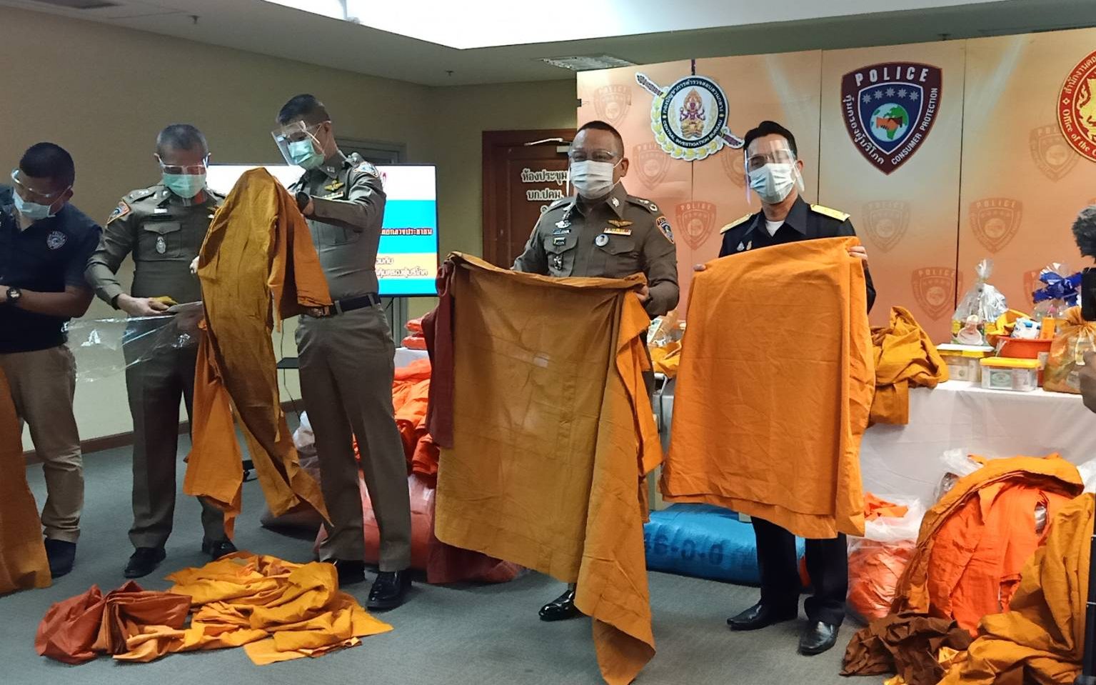 พลตำรวจตรีณัฐศักดิ์ เชาวนาศัย ผู้บังคับการกองปราบปรามการกระทำความผิดเกี่ยวกับการคุ้มครองผู้บริโภค หรือ ปคบ.ร่วมกับสำนักงานคณะกรรมการคุ้มครองผู้บริโภค หรือ สคบ. แถลงจับกุม ร้านจำหน่ายเครื่องสังฆภัณฑ์ ลักลอบนำชุดผ้าไตรจีวร ชุดสังฆทาน ที่ไม่ได้มาตรฐานมาจำหน่าย หลังได้รับการร้องเรียนจากวัดหลายแห่งในภาคใต้ ขณะเดียวกันโลกโซเชียลยังแห่แชร์คลิปพระวัดแห่งหนึ่ง ถ่ายวีดิโอพิสูจน์ผ้าไตรจีวรที่ญาติโยมซื้อมาถวายพบมีการปลอมย้อมแมวขายโดยนำผ้าไตรจีวรใหม่ห่อยัดไส้ในด้วยผ้าเก่าใช้แล้ว และกล่องหรือถุงสังฆทานเต็มไปด้วยของไม่มีคุณภาพราคาแพงเกินจริง