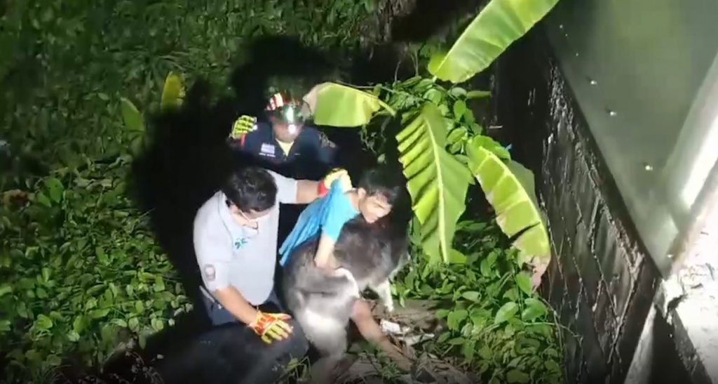 การตรวจสอบของอาสาสมัคร พบผู้บาดเจ็บ คือ นายคัมภีร์ วงศ์นิคม อายุ 32 ปี พลัดตกติดค้างอยู่ ขณะที่ใกล้กันพบสุนัขไซบีเรียนฮัสกี้ เพศเมีย อายุ 1 ปี สีขาวดำ ติดค้างอยู่ด้วย เจ้าหน้าที่จึงเร่งจัดเตรียมอุปกรณ์ ให้การช่วยเหลือ ใช้เวลา 20 นาที นำตัวทั้งคนและสุนัขออกมาได้ โดยนายคัมภีร์ มีแผลถลอกตามร่างกาย แต่เจ้าตัวบอกไม่ขอไปโรงพยาบาล ส่วนสาเหตุที่ตกลงไป เพราะต้องการไปช่วย “ไนท์กี้” สุนัขที่เลี้ยงไว้ ซึ่งติดค้างอยู่ด้านบนกำแพง แต่จังหวะกำลังช่วย ตัวเองเกิดพลัดตกลงไปจากหลังคาบ้านชั้น 2 ซึ่งมีความสูงถึง 3 เมตร จากนั้นทั้งตัวเองและสุนัขก็ไม่สามารถหาทางปีนกำแพงขึ้นมาได้ รวมถึงไม่กล้ากระโดดด้วย เพราะอีกด้านของกำแพงมีลักษณะเป็นป่า มีทั้งต้นไม้ และหญ้าขึ้นสูง ทำได้แต่ตะโกนเรียกให้คนมาช่วย กระทั่งน้องชายที่อยู่ในบ้านได้ยินเสียง จึงไปตามคนมาช่วย