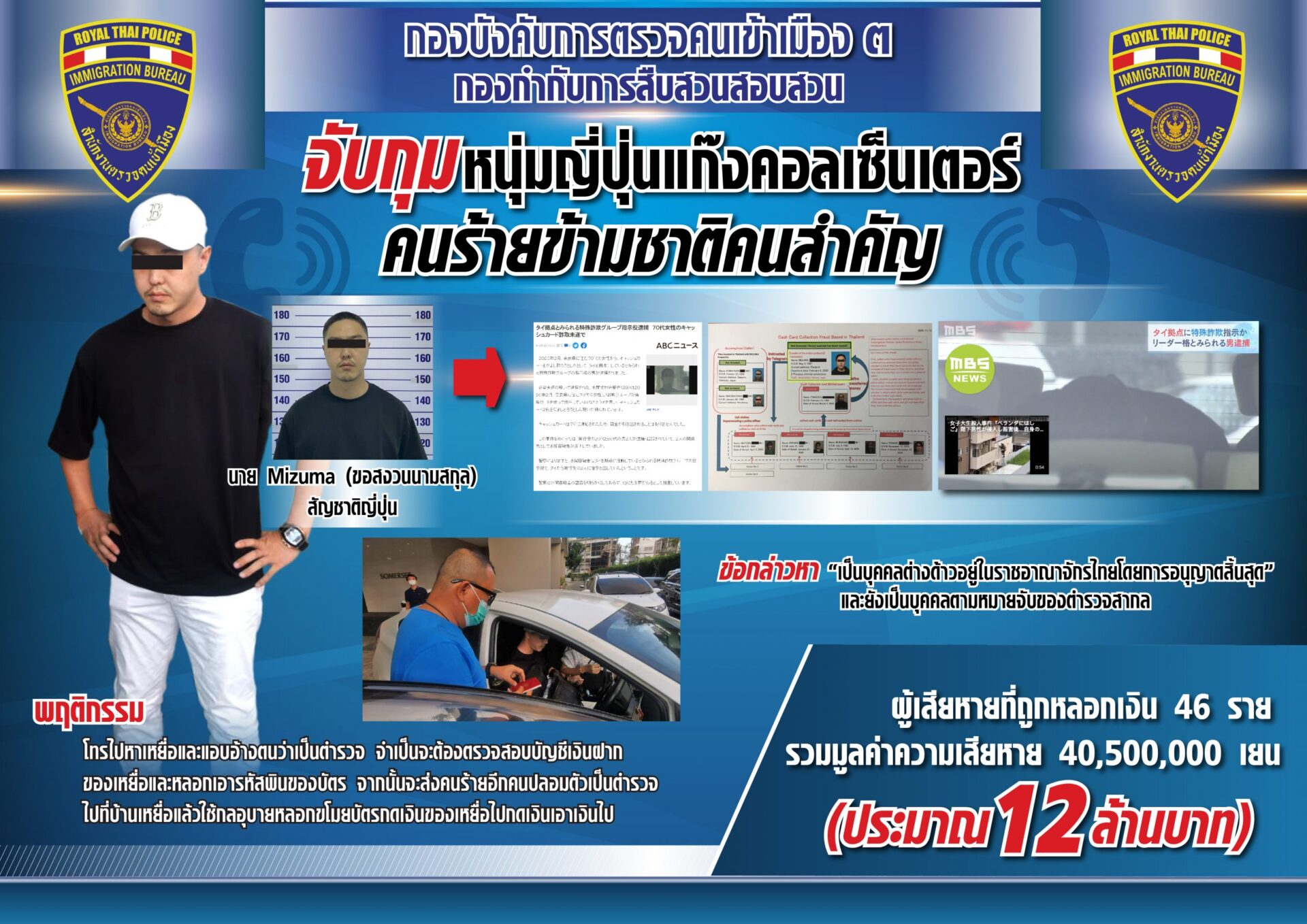 พล.ต.ท.สมพงษ์ ชิงดวง ผบช.สตม. แถลงผลการจับกุมแก๊งคอลเซ็นเตอร์ชาวญี่ปุ่น หลอกผู้เสียหาย 46 ราย รวมมูลค่ากว่า 12 ล้านบาท และใช้ประเทศไทยเป็นที่ซ่อนตัว การจับกุมในครั้งนี้ทางตำรวจตม. 3 ได้ สอดส่องดูพฤติกรรมของชาวต่างชาติที่อยู่ในประเทศไทยอย่างไม่พึงประสงค์ กระทั่ง สังเกตุพบ นายมิซูม่า ชาวญี่ปุ่น อายุ40 ปี เดินทางเข้าไทยด้วยวีซ่านักท่องเที่ยว และตลอด2ปีที่อยู่ในประเทศไทยไม่มีอาชีพเป็นหลักแหล่ง แต่สามารถดำรงชีพได้ เจ้าหน้าที่จึงเข้าไปตรวจสอบ กระทั่งได้รับข้อมูลจากทางการญี่ปุ่นว่านายมิซูม่า เป็นผู้ต้องหาที่กระทำผิดในประเทศญี่ปุ่นร่วมกับเพื่อนอีก 7 คน ลักษณะเป็นแก๊งคอลเซ็นเตอร์ อ้างตัวเป็นตำรวจและโทรไปหาเหยื่อเพื่อขอตรวจสอบบัญชีเงินฝาก โดยใช้วิธีพูดหว่านล้อมจนเหยื่อหลงเชื่อบอกเลขรหัสบัตรบัญชีธนาคาร จากนั้นนายมิซูม่าจะส่งเพื่อนให้ปลอมตัวเป็นตำรวจ ขอเข้าไปตรวจบ้านของเหยื่อและขโมยบัตรกดเงินของเหยื่อ เพื่อนำไปกดเงิน