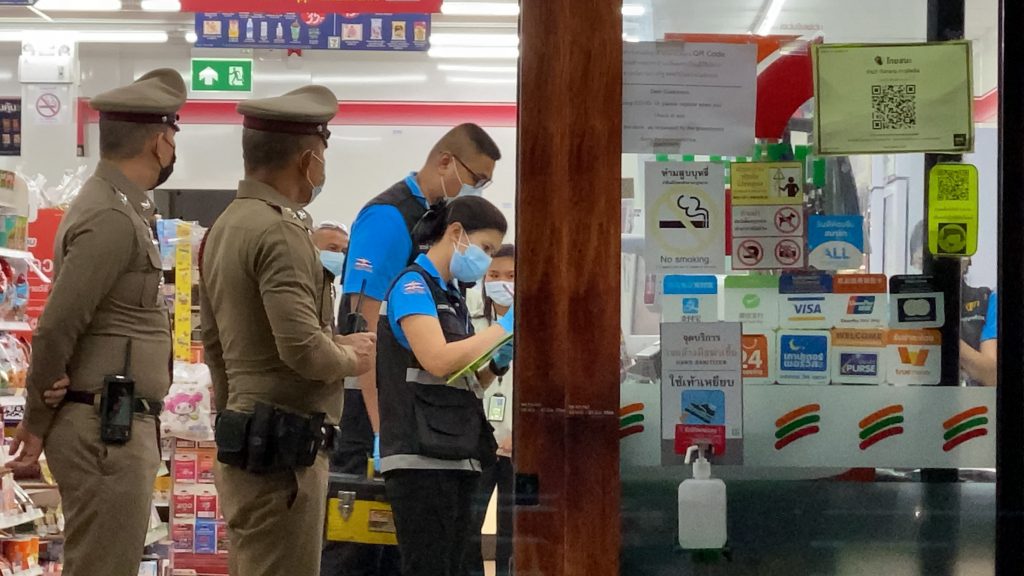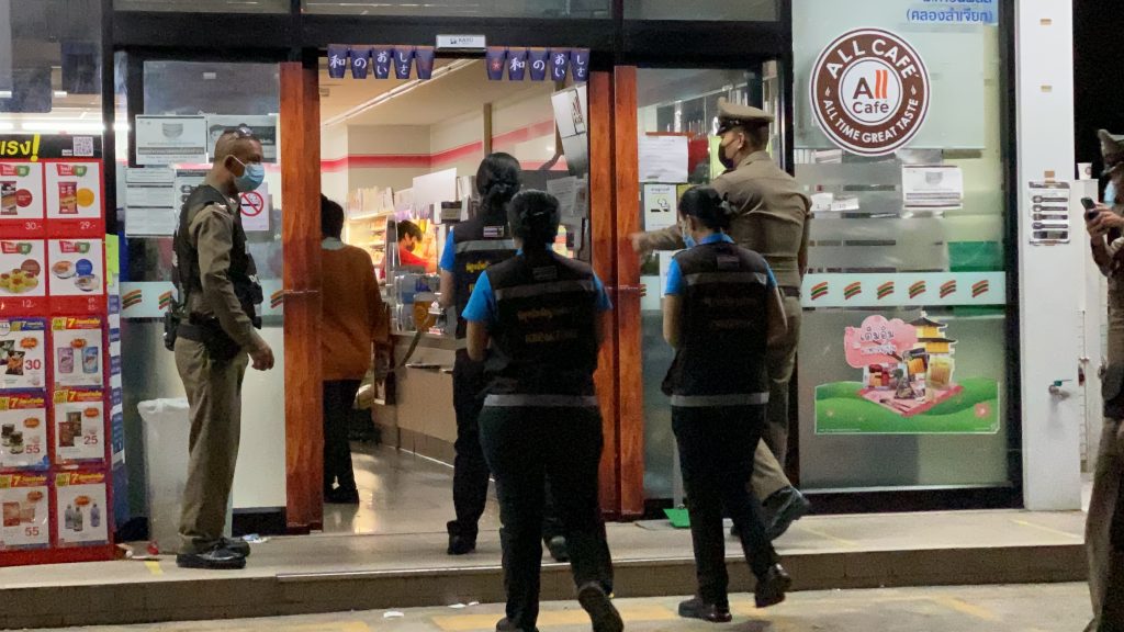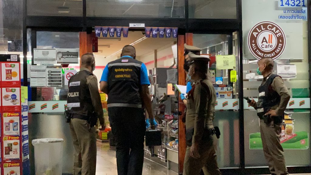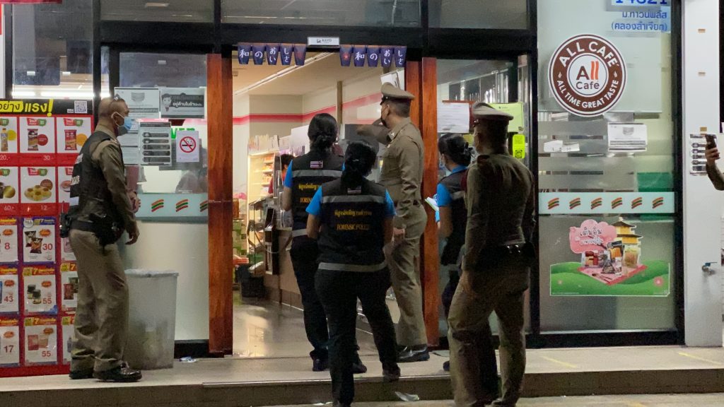 จากการสอบถามพนักงานร้านสะดวกซื้อที่อยู่ในเหตุการณ์ บอกว่า ขณะเกิดเหตุตนกับเพื่อนพนักงานกำลังจัดเตรียมสินค้า เพื่อรอเปิดร้านในช่วงเช้ามืด ซึ่งตนเองอยู่ด้านหลังร้าน ก็ได้เสียงคล้ายมีคนเดินเข้ามาทางหน้าประตู จึงออกมาดู ก็เห็นคนร้ายเป็นชายสวมเสื้อสีดำ กางเกงสามส่วน ผูกผ้าปิดปากสีดำ รูปร่างสูงประมาณ 160-170 เซนติเมตรไว้ผมรองทรง ถืออาวุธมีด บอกให้ตนกลับเข้าไปหลังร้าน ด้วยความตกใจกลัวได้รับอันตรายจึงยอมทำตาม ก่อนจะรีบขึ้นไปดูภาพวงจรปิด ระหว่างนั้นก็สังเกตเห็นคนร้ายเดินอ้อมเคาท์เตอร์เข้าไปรื้อค้นเงินและซิมบัตรเติมเงินโทรศัพท์ ไป ซึ่งก็ใช้เวลาไม่นาน ก่อนจะรีบไปขี่รถจักรยานยนต์ยี่ห้อฮอนด้า พีซีเอ็กซ์ สีเทา ขอบล้อสีทอง ไม่ทราบหมายเลขทะเบียน ซึ่งมีเพื่อนร่วมก่อเหตุอีกคนที่ใส่เสื้อแขนสั้นสีฟ้า สวมกางเกงยีนส์ขายาวรออยู่ ก่อนจะพากันหลบหนีไปอย่างรวดเร็ว