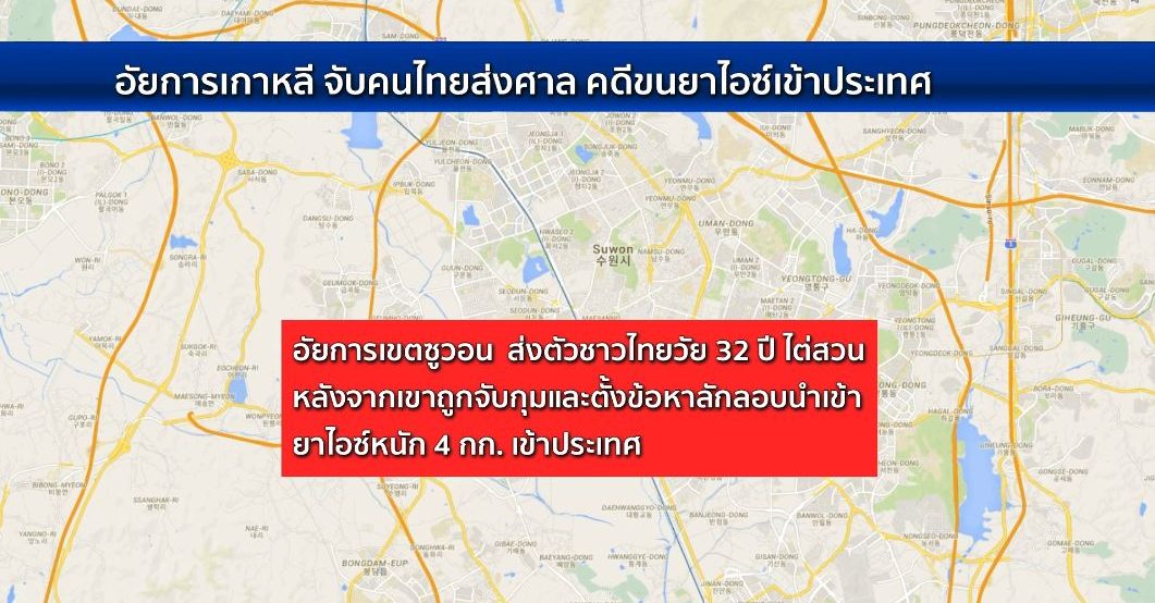 สำนักข่าว “ยอนฮัป” สื่อเกาหลีใต้ รายงานข้อมูลกรณีสำนักงานอัยการเขตซูวอน ในเมืองซูวอน ทางตอนใต้ของกรุงโซล ระบุว่า บุคคลสัญชาติไทย อายุ 32 ปี ได้ถูกส่งตัวเข้าสู่การพิจารณาของศาล หลังถูกจับกุมในข้อหาพยายามนำสารต้องห้ามเข้าประเทศ ผ่านการขนส่งทางอากาศเมื่อต้นเดือนพฤษภาคม