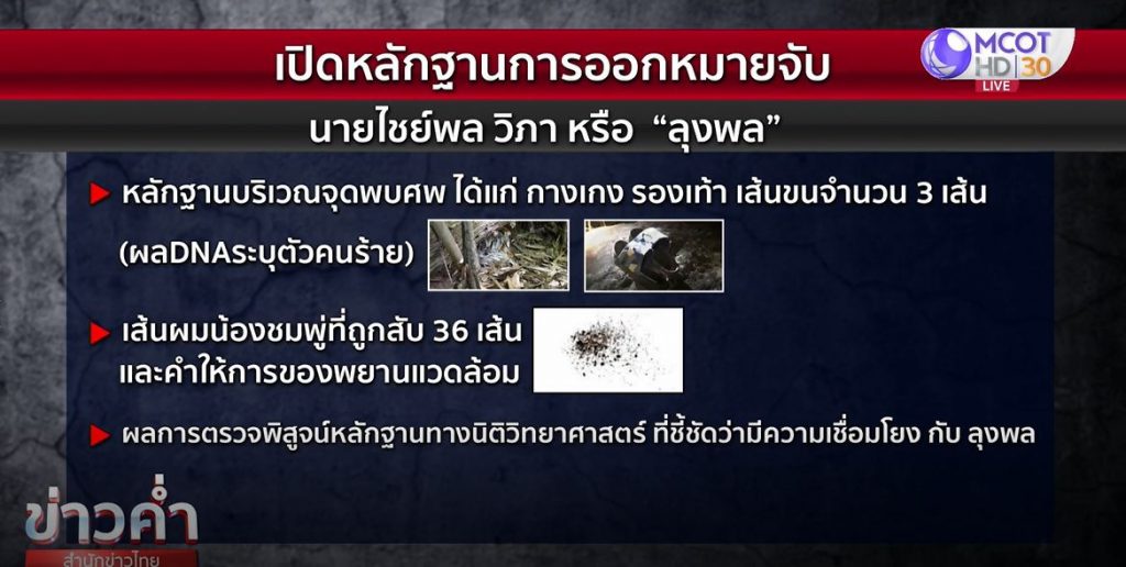 หลักฐานสำคัญที่นำไปสู่การออกหมายจับครั้งนี้ เป็นหลักฐานบริเวณจุดพบศพ “น้องชมพู่” ที่มีทั้งกางเกง รองเท้า และเส้นขน 3 เส้น ซึ่งตรวจดีเอ็นเอด้วยวิธีพิเศษ เพราะไม่พบรากขน ทำให้การตรวจครั้งแรกพบเพียงเชื่อมโยงกับเพศหญิง ซึ่งระบุได้ว่าเป็นญาติทางสายเลือดฝั่งแม่เด็ก ซึ่งอาจเป็นไปได้ทั้งเส้นขนของ “น้องชมพู่” หรือ แม่ พี่สาว ป้า น้า ยาย แต่การตรวจด้วยวิธีพิเศษพบความเข้ากันได้มากที่สุดกับ “ป้าแต๋น” ภรรยาของ “ลุงพล” ทำให้เส้นขนกลายเป็นหลักฐานสำคัญควบคู่ไปกับหลักฐานอีกชิ้น ซึ่งเป็นเส้นผมที่ตกอยู่ในรถของ “ลุงพล” โดยเส้นผมดังกล่าวเป็นเส้นผมกลุ่มเดียวกับเส้นผม 36 เส้นของ “น้องชมพู่” ที่ถูกตัดด้วยมีด ความยาวเส้นละประมาณ 1 เซนติเมตร และถูกพบบริเวณจุดพบศพของน้องชมพู่