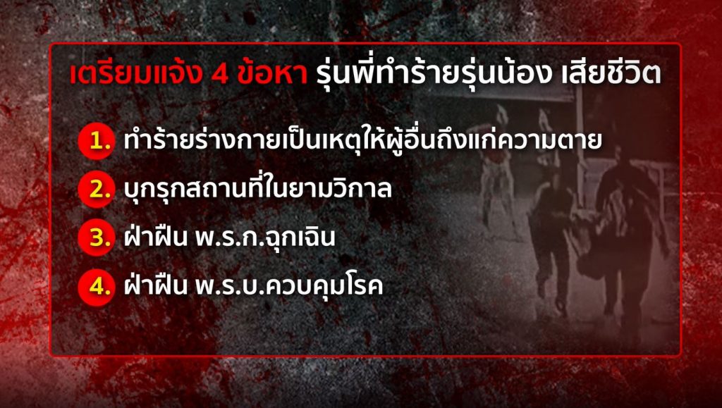 แต่ที่แน่ๆ รุ่นพี่ขาแตะ ทั้ง 12 คน โดนดำเนินคดีอย่างน้อย 2 ข้อหา ฐานฝ่าฝืน พ.ร.ก.ฉุกเฉิน และ พ.ร.บ.โรคติดต่อ ส่วนข้อหาร่วมกันทำร้ายร่างกายเป็นเหตุให้ผู้อื่นเสียชีวิตนั้น จะมีกี่คนต้องรอบทสรุปของพนักงานสอบสวน และอีก 1 ข้อหา บุกรุกสถานที่ราชการยามวิกาลนั้น ขึ้นอยู่กับทางผู้บริหารมหาวิทยาลัย ว่าจะใจแข็งแจ้งดำเนินคดีลูกศิษย์ปี 3 หรือไม่ หรือทั้งหมดที่เข้าไปในมหาวิทยาลัยช่วงเวลาดังกล่าวจะถูกดำเนินคดีทั้ง 40 คน .-สำนักข่าวไทย