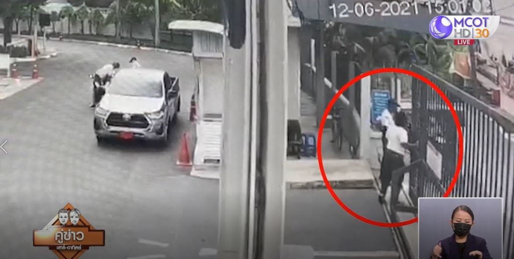 ภาพจากกล้องวงจรปิดบันทึกเหตุการณ์เมื่อเวลา 18.30 น. เมื่อวาน (12 มิ.ย.) โดยมีกระบะโตโยต้า รุ่นรีโว่ ป้ายแดง ขับเข้ามาภายในมหาวิทยาลัยและจอดรถ จากนั้นมีผู้ชายอายุประมาณ 25-30 ปี สวมเสื้อยืดคอกลมแขนสั้นสีขาว ลายการ์ตูน กางเกงยีนส์ขายาว สวมใส่รองเท้าผ้าใบ ได้เดินไปพูดคุยกับ รปภ.อีกคนก่อน จากนั้นสักพักได้เดินปรี่มาทางผู้ได้รับบาดเจ็บ ซึ่งนั่งในลักษณะหันหลังอยู่บนเก้าอี้ ก่อนลงมือทำร้ายผู้บาดเจ็บด้วยการชกถึง 6 ครั้ง จน รภป. เจ็บแน่นิ่งไป ก่อนจะมี รปภ.อีกคนเดินเข้ามาห้ามปราม กระทั่งผู้ก่อเหตุเดินจากไป