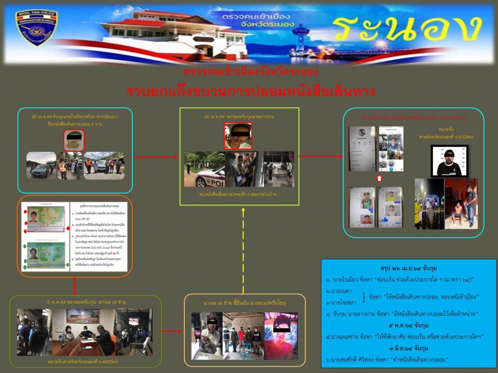 พล.ต.ท.สมพงษ์ ชิงดวง ผบช.สตม. แถลงจับกุมขบวนการปลอมแปลงหนังสือเดินทางและนำพาคนต่างด้าวหลบหนีเข้าประเทศ โดยชุดสืบสวนปราบปราม ตม.จว.ระนอง ร่วมกับ จนท.ทหาร ชุด ร้อย ร.2521 (จุดตรวจศิลาสลัก จปร.)ตั้งจุดตรวจจุดสกัดกั้นแล้วพบนายไวเมียว สัญชาติเมียนมา ขับรถยนต์กระบะทะเบียนชุมพร บรรทุกนายเนคา และนายโจเซลา สัญชาติเมียนมา จากการตรวจสอบพบว่าหนังสือเดินทางทั้ง 2 เล่ม ที่นำมาแสดงเป็นหนังสือเดินทางปลอม จึงจับกุมและสืบสวนขยายผลจับกุม ทราบว่าหนังสือเดินทางดังกล่าวได้รับมอบมาจากนายอาวปาย อายุ 30 ปี สัญชาติเมียนมา จึงได้เข้าปิดล้อมตรวจค้นบ้านพัก นายอาวปาย ใน อ.กระบุรี จว.ระนอง พบหนังสือเดินทางปลอม เพิ่มอีกจำนวน 4 เล่ม จึงจับกุมตัวนายอายปาย พร้อมแจ้งข้อหา “มีหนังสือเดินทางปลอมไว้เพื่อจำหน่าย” จากนั้นจับกุม นางเลเลข่าย ข้อหาให้ที่พัดพิงคนต่างด้าว และจับกุมตัวนายสมศักดิ์ ข้อหาทำหนังสือเดินทางปลอม