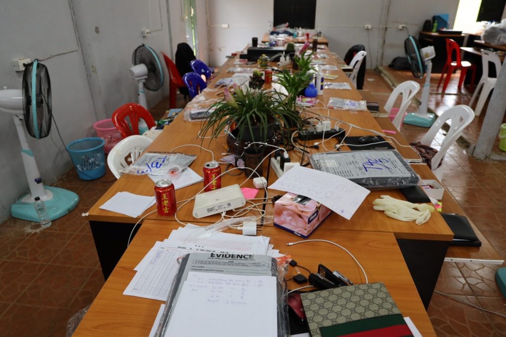 ทั้งนี้ ยังตรวจสอบพบอีกว่ากลุ่มคนเหล่านี้ มีการว่าจ้างคนในพื้นที่ให้คุ้มครองความปลอดภัย ลักษณะเป็นกลุ่มผู้มีอิทธิพล เจ้าหน้าที่ตำรวจจึงได้รวบรวมพยานหลักฐาน ขออนุมัติหมายค้นจากศาลเพื่อทำการตรวจค้นเป้าหมาย จำนวน 6 เป้าหมาย สามารถจับกุมผู้กระทำความผิดได้ทั้งหมด 53 คน เป็นผู้ต้องหาชาวจีน 40 คน ,ชาวเมียนมา 12 คน และ ชาวฟิลิปปินส์ 1 คนพร้อมตรวจยึดอุปกรณ์อิเล็กทรอนิกส์ ได้แก่ โทรศัพท์มือถือ, คอมพิวเตอร์, ซิมโทรศัพท์มือถือ, อุปกรณ์สำหรับปลอมหนังสือเดินทางของจีน และสิ่งของซึ่งได้ใช้ หรือมีไว้เพื่อใช้ในการกระทำความผิด รวมกว่า 500 รายการ