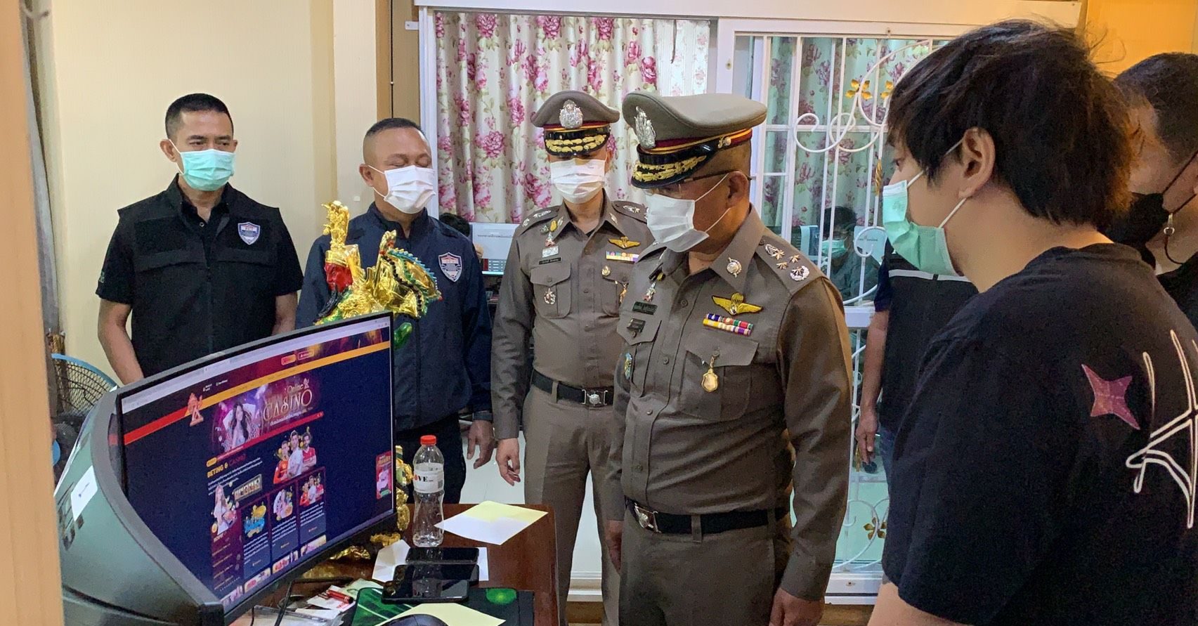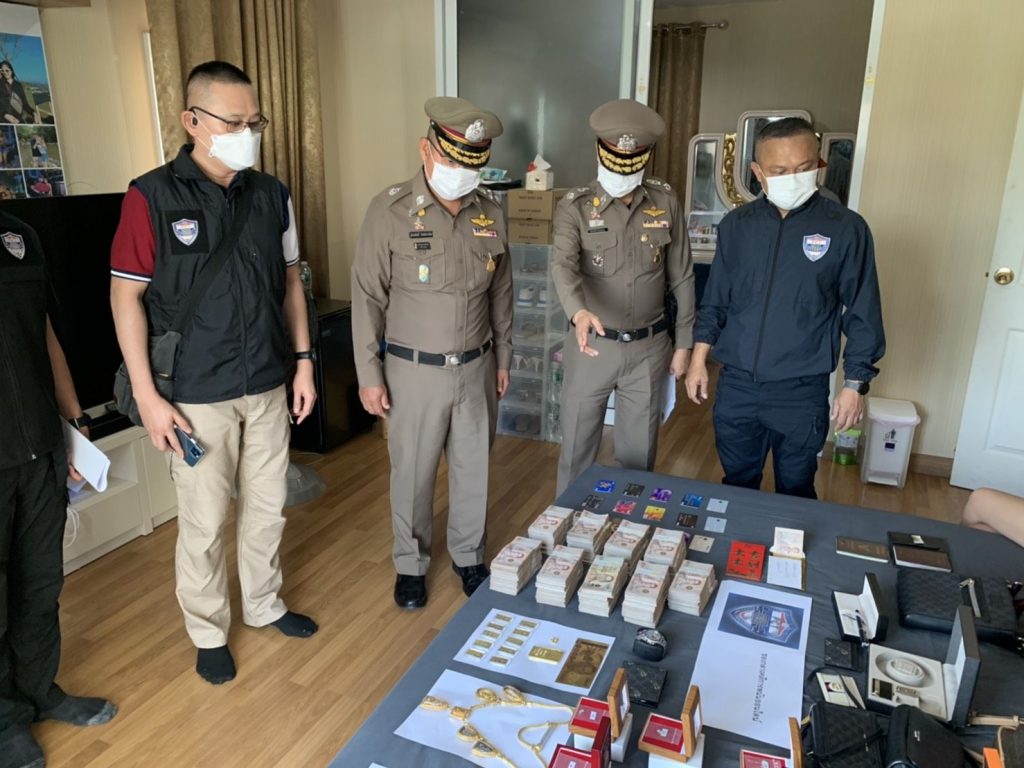 เจ้าหน้าที่ตำรวจจึงนำหมายค้นจากศาลอาญาเข้าตรวจค้นสถานที่ดังกล่าว จับกุมผู้ต้องหาจำนวน 13 คน ซึ่งขณะจับกุมกำลังอยู่ในระหว่างแชทคุยกับลูกค้า และยึดของกลาง เงินสด จำนวน 4,400,000 บาท สมุดบัญชีธนาคารต่างๆ รวม 20 เล่ม ทองคำรูปพรรณหนึ่งเส้นน้ำหนัก 20 บาท ทองคำรูปพรรณ 1 เส้น น้ำหนัก 5 บาท พร้อมพระเครื่องยอดนิยม 5 องค์ (ยังประเมินราคาไม่ได้) รถยนต์ จำนวน 2 คัน บัตรเอทีเอ็ม 16 ใบ คอมพิวเตอร์แบบพกพา 3 เครื่อง โทรศัพท์มือถือ 16 เครื่อง จอคอมพิวเตอร์ 11 เครื่อง คอมพิวเตอร์ตั้งโต๊ะ 11 เครื่อง รวม 11 รายการ มูลค่ากว่า 20 ล้านบาท