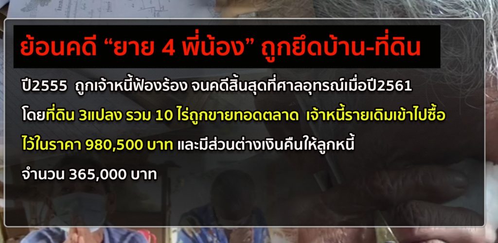 ย้อนดูที่มาของคดี ก่อนที่คุณยาย 4 พี่น้องชาวสุโขทัย จะถูกเจ้าหนี้กู้ยืมเงินฟ้องร้อง จนกระบวนการผ่านถึงชั้นบังคับคดี กระทั่งที่ดินและบ้านถูกยึดทรัพย์ขายทอดตลาด ทำให้ไม่มีที่อยู่อาศัย