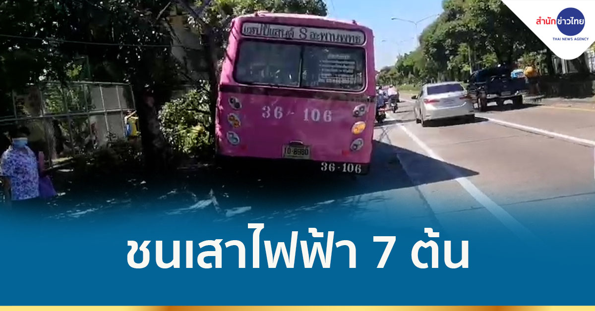 กรุงเทพฯ 3 ก.ค.-รถเมล์สาย 8 พุ่งชนป้ายซอย – เสาไฟฟ้า 7 ต้น บริเวณโค้งสนามกีฬาคลองจั่น เบื้องต้นคนขับและกระเป๋ารถเมล์ ได้รับบาดเจ็บ