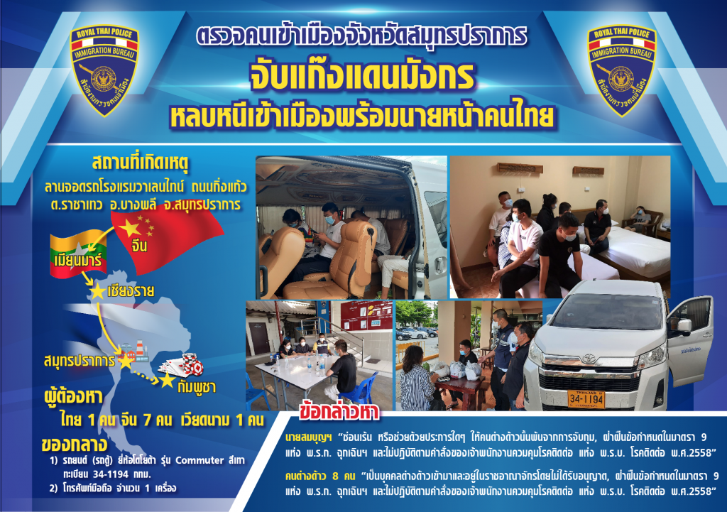 คดีที่ 3 ตำรวจ ตม.จังหวัดสมุทรปราการ จับแก๊งชาวจีนและเวียดนาม รวม 8 คน โดยมีชาวจีน 7 คน เวียดนาม 1 คน พร้อมนายหน้าคนไทย 1 คน / โดยมีพฤติการณ์ มีนายสมบุญ เป็นนายหน้าคนไทย ทำหน้าที่ขับรถ หรือขับรถนำ ส่วนผู้ต้องหาเหล่านี้ ลักลอบเข้ามาจากทางอำเภอเชียงแสน จังหวัดเชียงราย เดินทางเข้ามาที่อำเภอราชาเทวะ จังหวัดสมุทรปราการและพื้นที่กรุงเทพมหานครบางส่วน ซึ่งจากการตรวจสอบ ไม่มีเอกสารเดินทาง จึงแจ้งข้อหา เป็นบุคคลต่างด้าวเข้ามาและอยู่ในราชอาณาจักรโดยไม่ได้รับอนุญาต ส่วนนายสมบุญ ข้อหา ซ่อนเร้นและช่วยเหลือฯ