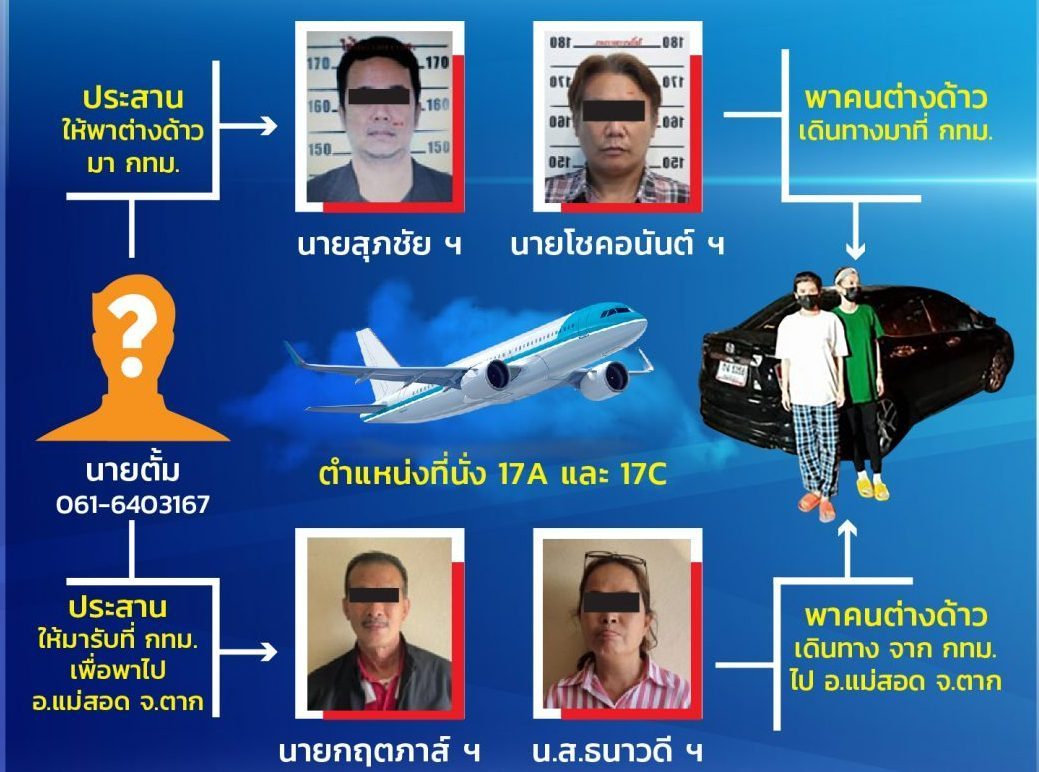 กทม. 15 ก.ค. – ขวบการลอบนำคนต่างด้านเข้าเมือง ใช้วิธีเหนือเมฆ ตีตั๋วเครื่องบินพา 2 สาวเวียดนาม จากชายแดนใต้บินเข้ากรุงเทพ เพื่อต่อรถยนต์หนีไป จังหวัดตากแต่ไม่รอดถูกรวบทั้งขบวนการ 6 คน