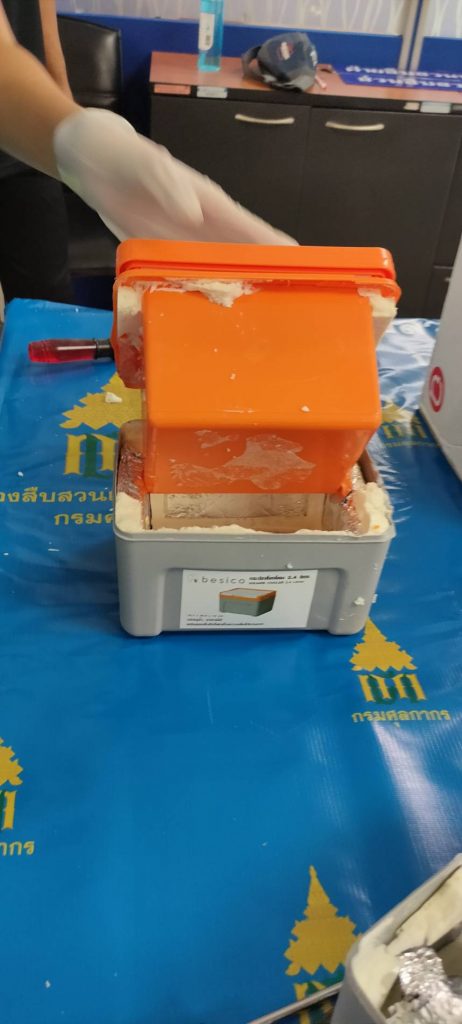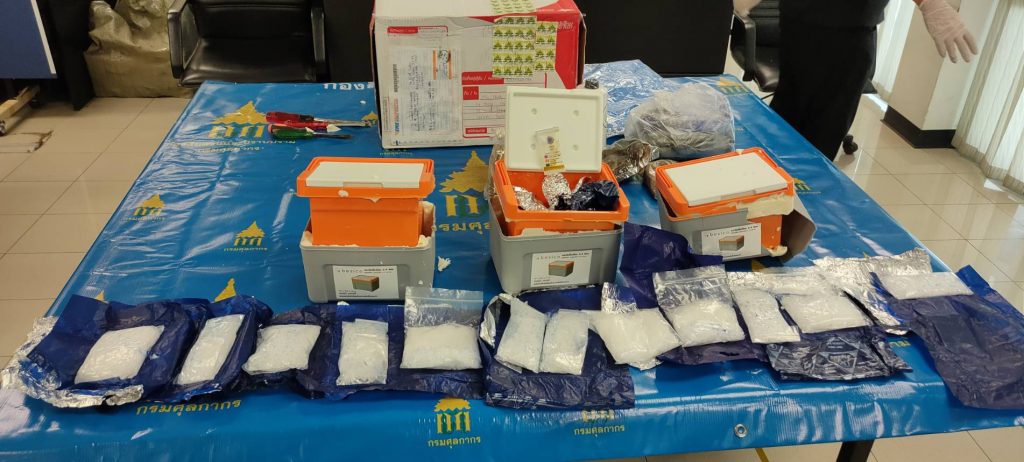 นายวิชัย ไชยมงคล เลขาธิการคณะกรรมการป้องกันและปราบปรามยาเสพติด (เลขาธิการ ป.ป.ส.) เผย วันที่ 16 กรกฎาคม 2564 หน่วยสกัดกั้นยาเสพติดท่าอากาศยาน หรือ Airport Interdictoin Task Force (AITF) ประกอบด้วย สำนักงาน ป.ป.ส. ศุลกากร บช.ปส. และ ศรภ. ตรวจยึด ไอซ์ 1,034 กรัม ซุกซ่อนในกระติกเก็บความเย็นขนาดเล็ก 3 ใบ ณ ศูนย์ไปรษณีย์ขาออก สุวรรณภูมิ ส่งมาจากจังหวัดเชียงราย เตรียมส่งออกไปปลายทางประเทศอิสราเอล ผลการตรวจสอบ พบยาเสพติดให้โทษประเภท 1 ไอซ์ (เมทแอมฟาตามีน) น้ำหนักรวมสิ่งห่อหุ้มประมาณ 1,034 กรัม ซุกซ่อนอยู่ภายในผนังกระติกน้ำแข็งขนาดเล็ก เก็บความเย็น จำนวน 3 กล่อง กล่องที่ 1 น้ำหนัก 342 กรัม กล่องที่ 2 น้ำหนัก 350 กรัม กล่องที่ 3 น้ำหนัก 342 กรัม จึงร่วมกันทำการตรวจยึด และรวบรวมพยานหลักฐาน และจะนำของกลางส่งพนักงานสอบสวน บช.ปส. เพื่อดำเนินคดีตามกฎหมาย และสืบสวนขยายผลผู้ส่งยาเสพติดต่อไป