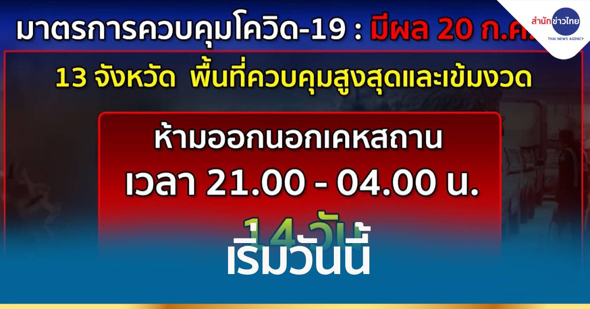 มาตรการต่างๆ ที่เริ่มบังคับใช้ใน 13 จังหวัดพื้นที่ควบคุมเข้มงวดและสูงสุด หรือพื้นที่สีแดงเข้ม คือ กรุงเทพฯ นครปฐม นนทบุรี ปทุมธานี สมุทรปราการ สมุทรสาคร ฉะเชิงเทรา ชลบุรี พระนครศรีอยุธยา นราธิวาส ปัตตานี ยะลา และสงขลา เริ่มตั้งแต่