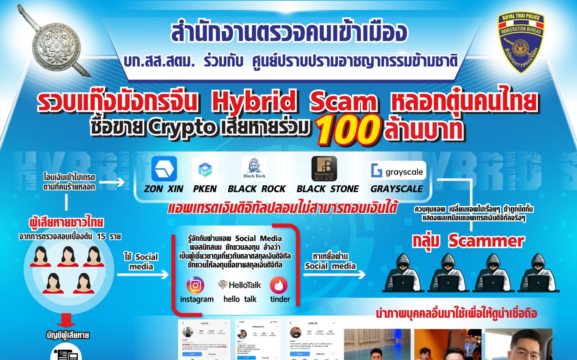 กทม.23 ก.ค.- รวบแก๊งมังกรทำ Hybrid scam หลอกผู้เสียหายชาวไทยหลายรายลงทุนซื้อขายสกุลเงินดิจิทัลมูลค่าความเสียหายกว่า 100 ล้านบาท”