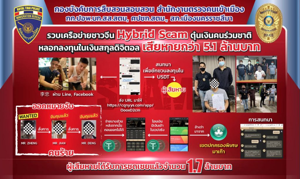 สืบเนื่องจาก กองบังคับการสืบสวนสอบสวน สำนักงานตรวจคนเข้าเมืองและศูนย์ปราบปรามคนร้ายข้ามชาติและเข้าเมืองโดยผิดกฏหมาย สำนักงานตรวจคนเข้าเมือง ได้รับการร้องเรียนจากผู้เสียหายสัญชาติจีนว่าได้ถูกคนร้ายที่รู้จักกันผ่านแอพพลิเคชั่น FACEBOOK ใช้ชื่อว่า “ZHONG” (จง) ได้เข้ามาพูดคุยเพื่อตีสนิท โดยอ้างว่าเป็นคนจีนที่เข้ามาทำธุรกิจที่ประเทศไทย ต่อมาได้อ้างว่าปัจจุบันได้ทำการลงทุนในตลาดสกุลเงินดิจิตอล โดยได้ทำการส่งข้อมูลให้ผู้เสียหายดูว่าสามารถได้รับผลประโยชน์จริง ต่อมาคนร้ายได้ทำการชักชวนให้ผู้เสียหายลงทุน ซึ่งได้ส่ง URL ชื่อ https://www.cqnyys.com/app และให้ผู้เสียหายทำการสมัครและทำการโอนเงินเพื่อลงทุน โดยในช่วงแรกเมื่อผู้เสียหายลงทุนก็พบว่ามีเงินที่เพิ่มขึ้นในระบบจริง และเมื่อผู้เสียหายต้องการที่จะถอนเงินออกจากระบบ ก็ถูกคนร้ายอ้างว่าจะต้องมีการโอนเงินค่าประกัน ในการรับประกัน user จากนั้นเมื่อผู้เสียหายโอนแล้วพบว่าสามารถถอนเงินออกมาได้จากพอร์ทจริง จึงลงทุนเพิ่มไปในพอร์ทตามคำชักชวนของคนร้าย รวมมูลค่า กว่า 5.1 ล้านบาท จากนั้นเมื่อผู้เสียหายได้โอนเงินแล้วปรากฏว่าเว็บไซต์ดังกล่าวได้ปิดไป จึงเชื่อว่าได้ถูกหลอกลวงและเข้าแจ้งความร้องทุกข์ต่อพนักงานสอบสวน เพื่อดำเนินคดีตามกฏหมาย
