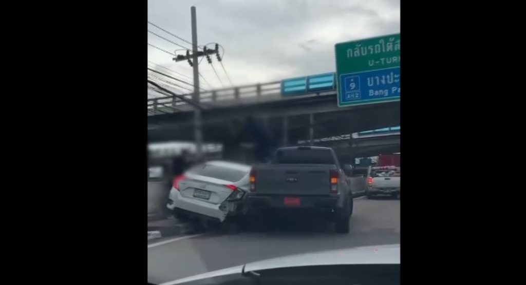 จากกรณีคลิปเหตุการณ์ชาย 2 คน ขับกระบะป้ายแดงชนรถเก๋งซีวิคจนประสบอุบัติเหตุ บริเวณก่อนถึงแยกประเวศ กทม. จากนั้นผู้ก่อเหตุขึ้นไปบนหลังคารถของผู้เสียหาย และใช้มีดฟันไปที่รถหลายครั้ง ขณะเดียวกันยังมีชายอีกรายถือวัถตุคล้ายปืน ตรงเข้าไปที่รถผู้เสียหายด้วย โดยโลกออนไลน์ยังเผยข้อมูลอ้างว่าคนขับรถกระบะเป็นเจ้าหน้าที่ตำรวจ ทำให้เกิดการวิพากษ์วิจารณ์อย่างหนัก