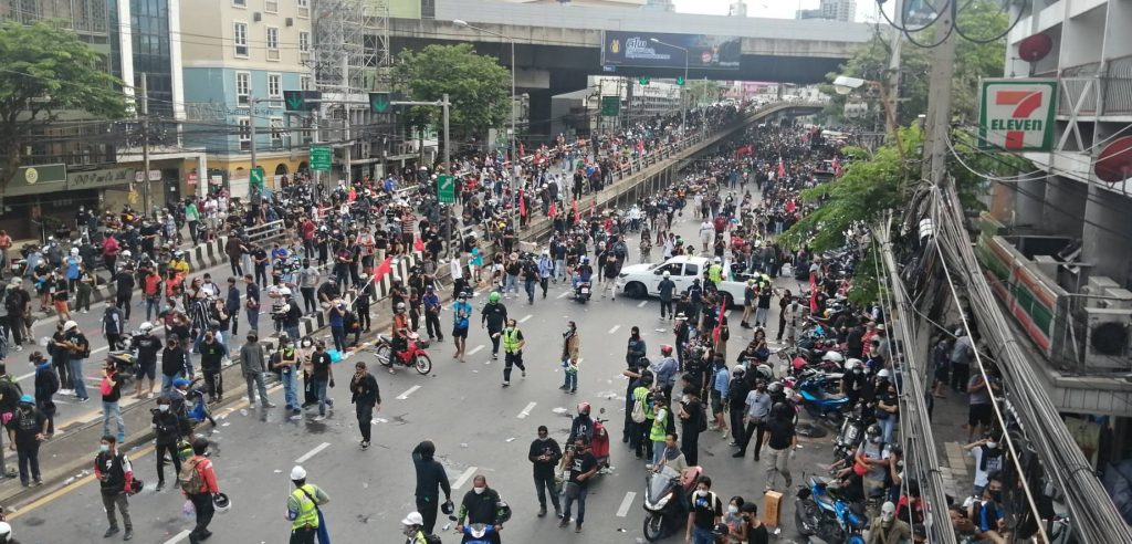 ขณะที่ได้นำรถเครื่องขยายเสียงเข้ามาจอดบริเวณใต้ทางด่วนดินแดง ก่อนถึงจุดประทะประมาณ 100 เมตร โดยแกนนำได้ประกาศให้ผู้ชุมนุมรับทราบว่าขอให้ทุกคนนั้นรักษาเนื้อ รักษาตัว หากไม่ไหวให้ออกมาจากแนวปะทะ เนื่องจากมีเวลาในการต่อสู้อีกหลายครั้ง ซึ่งการมาชุมนุมในวันนี้ ก็เพื่อเรียกให้พลเอกประยุทธ์ จันทร์โอชา นายกรัฐมนตรี ลาออกจากตำแหน่ง และให้บุคคลที่มีความสามารถเข้ามาบริหารบ้านเมืองแทนในช่วงที่มีการระบาดของโควิด-19.-สำนักข่าวไทย