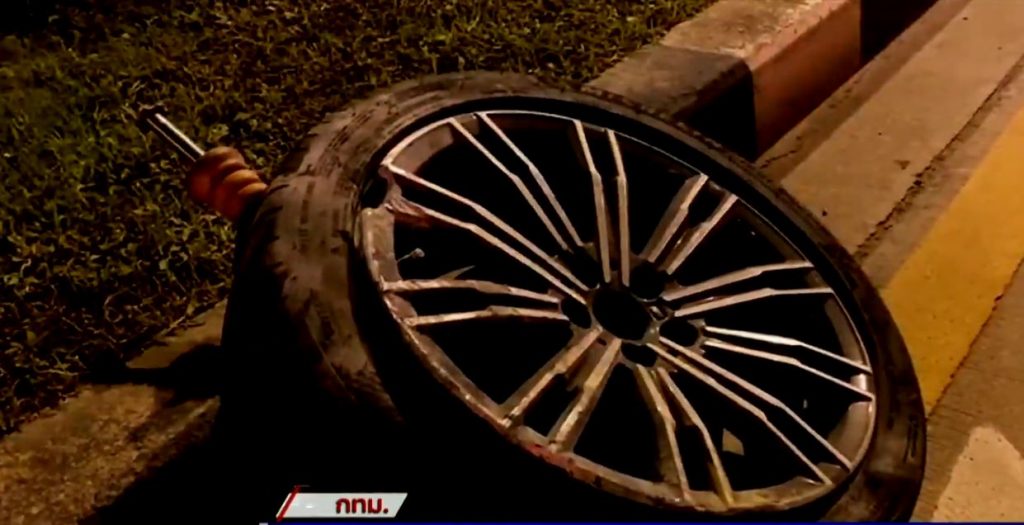 ที่เกิดเหตุอยู่ถนนเทพรักษ์ฝั่งมุ่งหน้าไปถนนพหลโยธิน บริเวณกลางถนน ช่วงเลยทางเข้าวัดหนองผักชีประมาณ 200 เมตร พบรถยนต์ BMW รุ่น 320D สีดำ ทะเบียนป้ายแดง ข-8888 กรุงเทพมหานคร จอดขวางถนนหลังจากชนต้นไม้ สภาพรถถุงลมนิรภัยทำงาน กันชนหน้าเสียหายแทบทั้งหมด ล้อหน้าขวาหลุด ประตูหน้าฝั่งซ้ายยุบ มีเศษกระจกตกเกลื่อนอยู่บนพื้นถนน ห่างไปประมาณ 300 เมตร บนเกาะกลางถนน พบล้อหน้าตกอยู่