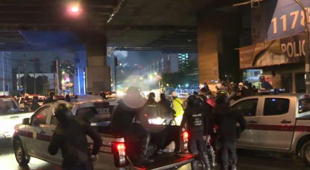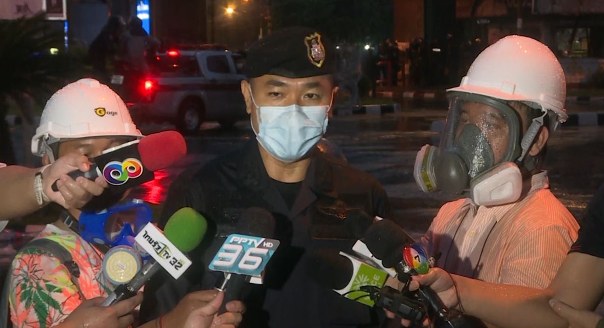 ด้าน พ.ต.อ.กฤษณะ พัฒนเจริญ โฆษกสำนักงานตำรวจแห่งชาติ กล่าวว่า ในการชุมนุมวันนี้ พบว่ากลุ่มผู้ชุมนุมพยายามใช้อาวุธ ทั้งขวดแก้ว กระสุนหัวลูกแก้ว ลูกนอต ระเบิดเพลิง และประทัดยักษ์ สร้างความวุ่นวายต่อเนื่อง ทำให้การชุมนุมไม่อยู่บนพื้นฐานของกฎหมาย เจ้าหน้าที่พยายามเจรจาผ่านเครื่องขยายเสียง ขอให้ผู้ชุมนุมยุติการชุมนุม แต่ไม่ประสบผลสำเร็จ ดังนั้น เพื่อไม่ให้สถานการณ์วุ่นวาย และไม่ให้ทรัพย์สินทางราชการเสียหายมากไปกว่านี้ เจ้าหน้าที่จำเป็นต้องออกมาควบคุมสถานการณ์ โดยยืนยันว่า การออกมากระชับพื้นที่เป็นไปตามกฎหมาย ตามหลักสากล มีการจัดการแจ้งเตือนเป็นระยะ ใช้ความละมุนละม่อม อีกทั้งอุปกรณ์ที่ใช้ก็เป็นไปตามหลักสากล และได้รับอนุญาตให้ใช้เท่าที่จำเป็นเท่านั้น โดยเจ้าหน้าที่ทำตามกฎหมาย เพื่อให้กลุ่มผู้ชุมนุมยุติการก่อความวุ่นวาย และให้เดินทางกลับบ้านทันที