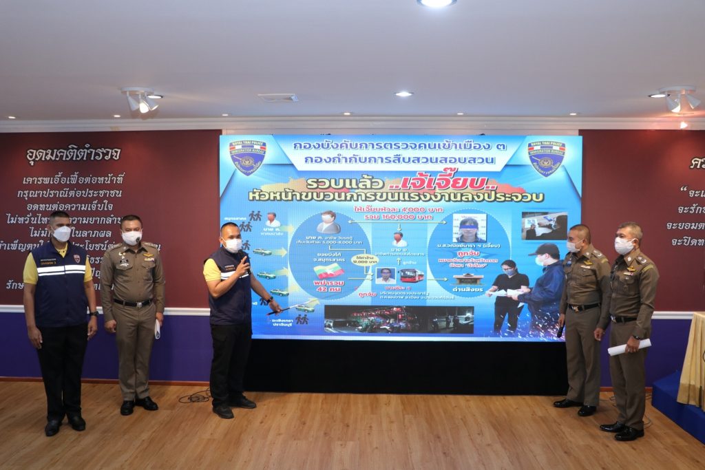 สำนักงานตรวจคนเข้าเมือง โดย พล.ต.ท.สมพงษ์ ชิงดวง ผบช.สตม. ,พล.ต.ต.อาชยน ไกรทอง รอง ผบช.สตม., พล.ต.ต.รุ่งโรจน์ ฐากูรปุณยสิริ ผบก.ตม.3, พ.ต.อ.ทรงโปรด สิริสุขะ รอง ผบก.ตม.3, พ.ต.อ.กฤตัชญ์ บำรุงรัตนยศ รอง ผบก.ตม.3, พ.ต.อ.รัชธพงศ์ เตี้ยสุด รอง ผบก.ตม.3, พ.ต.อ.หฤษฎ์ เอกอุรุ รอง ผบก.ตม.3 และ ว่าที่ พ.ต.อ.จิรพงศ์ รุจิรดำรงค์ชัย ผกก.สส.บก.ตม.3 ร่วมแถลงข่าวการจับกุม”เจ๊เจี๊ยบ”หัวหน้าขบวนการขนแรงงานลงประจวบ