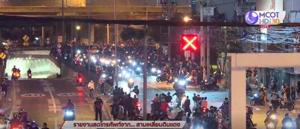 บรรยากาศการชุมนุมบริเวณแยกดินแดง ต่อเนื่องถึงสามเหลี่ยมดินแดง ถนนราชปรารภ มีการปะทะอย่างต่อเนื่อง ซึ่งเกิดขึ้นตั้งแต่เวลา 17.00 น.ที่ผ่านมา เมื่อกลุ่มผู้ชุมนุมอาชีวะได้เข้ามาในพื้นที่แยกดินแดง พร้อมกับพยายามที่จะรื้อแผงเหล็กที่เจ้าหน้าที่นำมาปิดกั้นบนถนนดินแดง เลี่ยงถนนวิภาวดีรังสิตขาออก รวมถึงรั้วลวดหนาม ที่เจ้าหน้าที่นำมาปั้นกั้นทางกลับรถบริเวณเกาะกลางแยกดินแดง และพยายามจะรื้อตู้คอนเทนเนอร์บนถนนวิภาวดีรังสิตออกด้วย มีการขว้างปาขวดแก้ว ประทัดยักษ์ พลุดาวกระจาย ใส่เจ้าหน้าที่ตำรวจควบคุมฝูงชน ด้านหลังตู้คอนเทนเนอร์