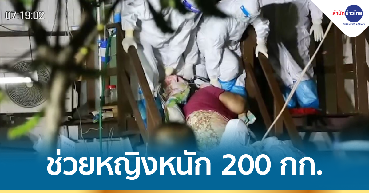 กรุงเทพฯ 19 ส.ค.-เจ้าหน้าที่กู้ภัย เข้าช่วยเหลือหญิงวัย 65 ปี หนัก 200 กก. ติดโควิด-19 ในบ้านย่านดอนเมือง ไปส่งยังสถานที่กักตัว ระหว่างรอเตียงรักษา