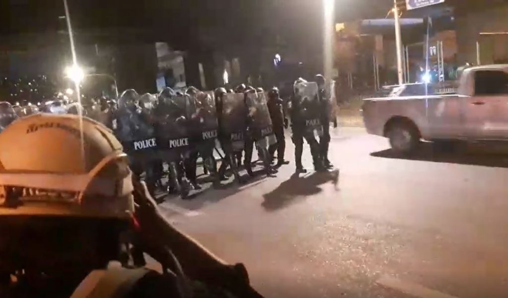 17.09 น. ควบคุมฝูงชนหลังตู้คอนเทนเนอร์ยิงแก๊สน้ำตาลูกแรกออกมา หลังกลุ่มเด็กเผาขยะใต้ทางด่วน ก่อนจุดไฟเผาผ้าชุบน้ำมัน