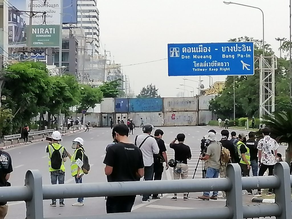 16.55 น. กลุ่มวัยรุ่นถอยออกจากแนวตู้คอนเทนเนอร์ เข้าใต้ทางด่วนดินแดง จุดไฟเผาขยะ ใช้ควันป่วนควบคุมฝูงชน