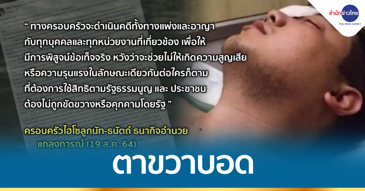 กรุงเทพฯ 20 ส.ค.-ครอบครัวยืนยัน “ไฮโซลูกนัท” สูญเสียตาขวา จากเหตุสลายการชุมนุม เมื่อวันที่ 13 ส.ค.64 พร้อมยืนยันจะดำเนินคดีทั้งทางแพ่งและอาญากับทุกหน่วยงานที่เกี่ยวข้อง