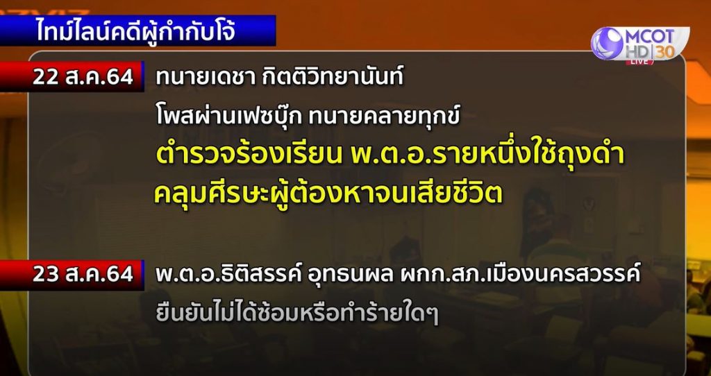 วันที่ 22 ส.ค.64 นายเดชา กิตติวิทยานันท์ ทนายความชื่อดัง โพสต์ข้อความผ่านเพจเฟซบุ๊ก “ทนายคลายทุกข์” ระบุมีตำรวจชั้นผู้น้อยร้องเรียนมาที่ทนายคลายทุกข์ว่ามีกรณี พ.ต.อ.รายหนึ่ง เรียกเงินผู้ต้องหา 2 ล้านบาท และนำถุงคลุมศีรษะจนเสียชีวิต แล้วนำศพส่งโรงพยาบาล พร้อมแฉว่ายังบังคับลูกน้องว่าให้บอกกับหมอว่าเสพยาเกินขนาดจนตาย พร้อมปล่อยตัวผู้ต้องหาหญิงไป ให้ปิดปากแลกกับไม่ต้องถูกดำเนินคดียาเสพติด ตำรวจชั้นผู้น้อย ระบุผู้กำกับโจ้ได้เรียกพ่อผู้เสียชีวิตมาเพื่อเคลียร์คดีให้จบ
