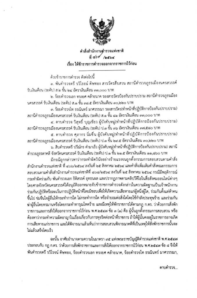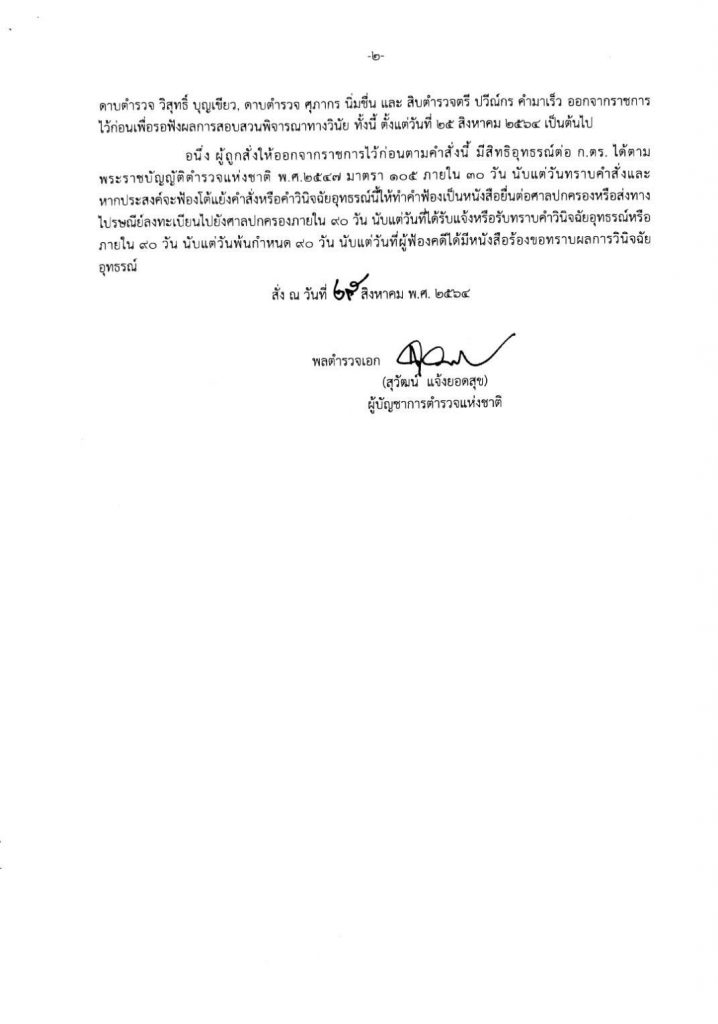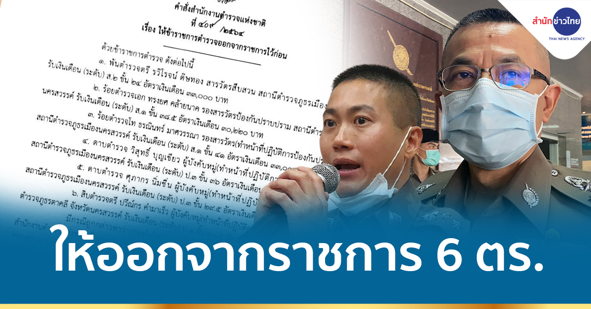 ฉะนั้น อาศัยอำนาจตามความในมาตรา 95 แห่งพระราชบัญญัติตำรวจแห่งชาติ พ.ศ.2547 ประกอบกับ กฎ ก.ตร. ว่าด้วยการสั่งพักราชการและการสั่งให้ออกจากราชการไว้ก่อน พ.ศ.2547 ข้อ 8 จึงให้ พันตำรวจตรี รวิโรจน์ ดิษทอง, ร้อยตำรวจเอก ทรงยศ คล้ายนาค, ร้อยตำรวจโท ธรณินทร์ มาศวรรณา, ดาบตำรวจ วิสุทธิ์ บุญเขียว, ดาบตำรวจ ตุภากร นิ่มชื่น และ สิบตำรวจตรี ปวีณ์กร คำมาเร็ว ออกจากราชการไว้ก่อน เพื่อรอฟังผลการสอบสวนพิจารณาทางวินัย ทั้งนี้ ตั้งแต่วันที่ 25 สิงหาคม 2564 เป็นต้นไป .-สำนักข่าวไทย
