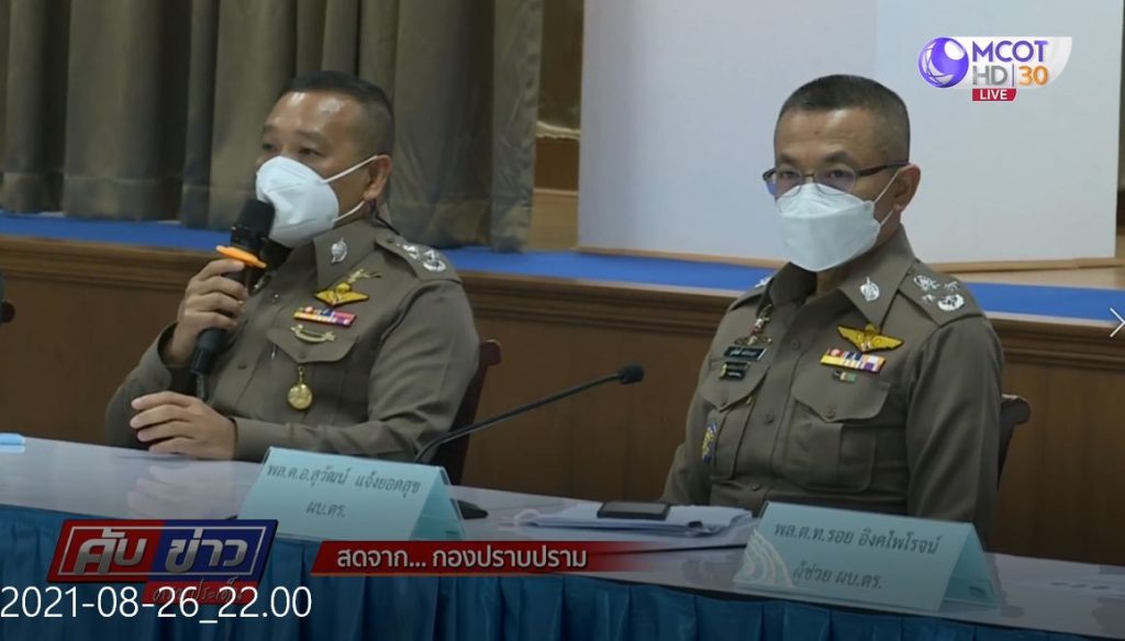 พล.ต.อ.สุวัฒน์ แจ้งยอดสุข ผบ.ตร. นำแถลงหลังควบคุมตัว “ผู้กำกับโจ้” ได้ที่ชลบุรี และนำตัวมาที่กองปราบปราม ย้ำเราพยายามทำเพื่อให้สังคมเห็นว่า เราไม่เคยปกป้องคนทำผิด เราเอาทุกคนเข้ามาสู่กระบวนการยุติธรรม มันอาจไม่ได้ช่วยให้สิ่งที่สูญเสียไปมันดีขึ้น แต่อย่างน้อยก็ให้เห็นว่า เราไม่เคยปกป้อง แล้วสังคมตำรวจ องค์กรตำรวจ จะอยู่ได้ด้วยความเชื่อมั่นของพี่น้องประชาชน