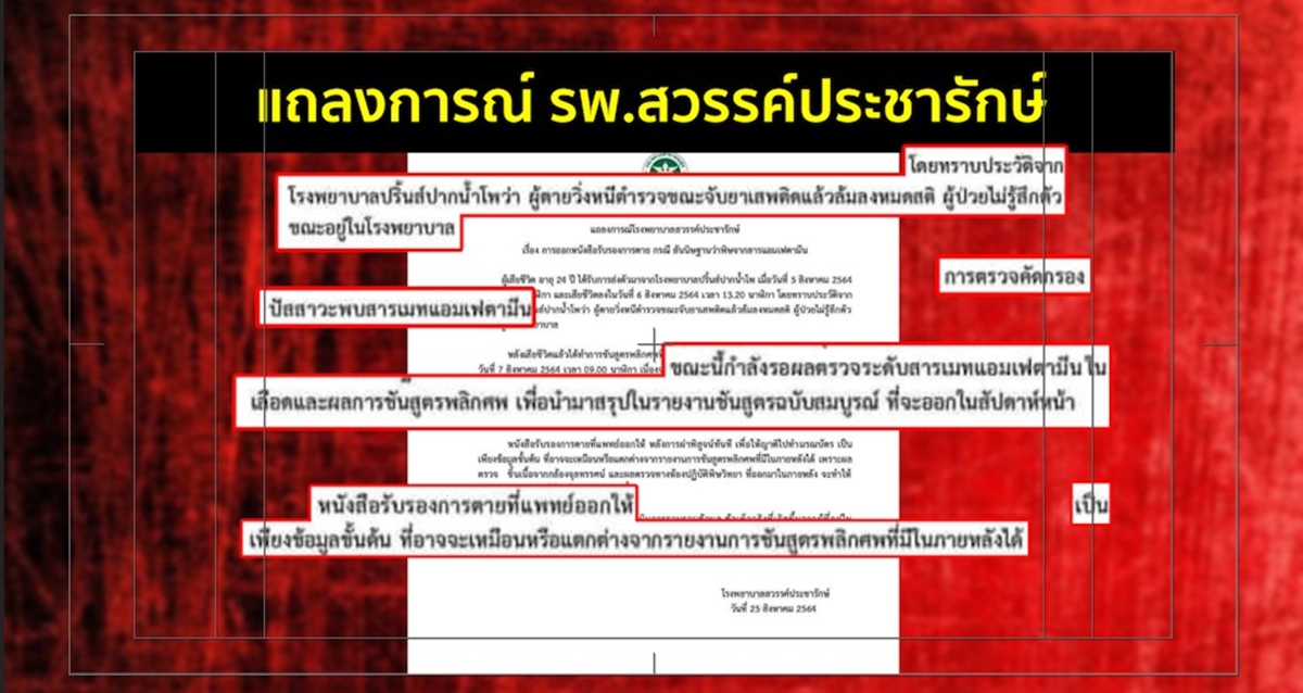 6 ส.ค.64 : ผลชันสูตรของโรงพยาบาลสวรรค์ประชารักษ์ นครสวรรค์ ระบุสาเหตุว่า ผู้ต้องหาเสียชีวิตจากพิษสารแอมเฟตามีน โดยระบุว่า การตรวจคัดกรองปัสสาวะ พบสารเมทแอมเฟตามีน และสารแอมเฟตามีน ต่อมาโรงพยาบาลสวรรค์ประชารักษ์ ได้ออกแถลงการณ์เรื่องการออกหนังสือรับรองการตาย กรณีสันนิษฐานว่าพิษจากสารแอมเฟตามีน โดยระบุว่า เป็นการออกหนังสือรับรองการตาย เพื่อให้ญาตินำไปทำใบมรณบัตร เป็นเพียงข้อมูลเบื้องต้นเท่านั้น