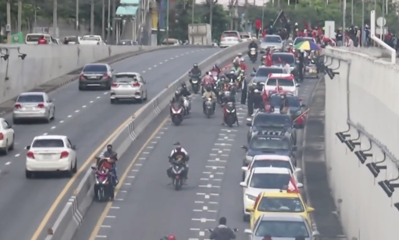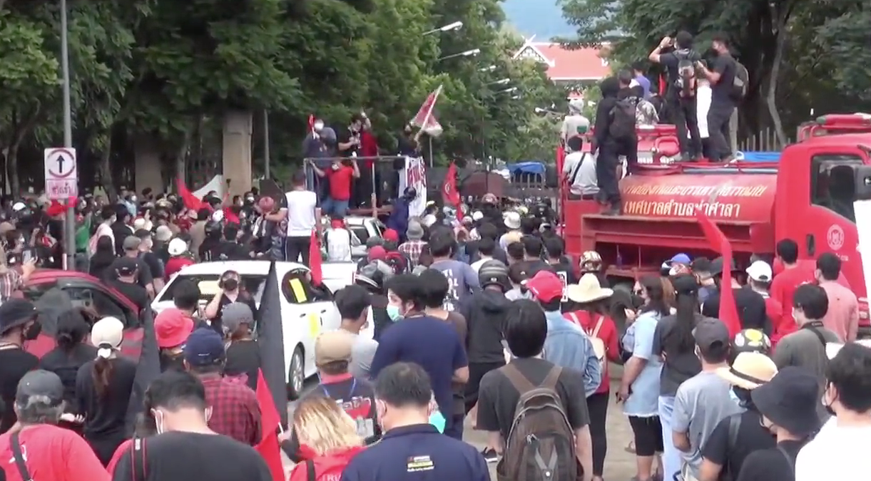 ส่วนที่ จ.เชียงใหม่ กลุ่มผู้ชุมชนคาร์ม็อบทั้งรถจักรยานยนต์และรถยนต์ เคลื่อนขบวนไปศูนย์ราชการจังหวัดเชียงใหม่ เมื่อขบวนมาถึงประตูทางเข้า มีเจ้าหน้าที่ตำรวจ และเจ้าหน้าที่อาสารักษาดินแดนนำแบริเออร์ใส่น้ำมาวางขวาง บริเวณประตูทางเข้า ทางแกนนำได้ประกาศเพื่อขอเข้าไปใช้พื้นที่ในศูนย์ราชการจังหวัดเชียงใหม่เพื่อยื่นข้อเสนอให้ผู้ว่าราชการจังหวัดเชียงใหม่ แต่การเจรจาไม่เป็นผล กลุ่มผุ้ชุมนุมได้เข้ารื้อแท่งแบริเออร์และเทน้ำทิ้ง เคลื่อนขบวนเข้าไปบริเวณประตูเหล็ก มีการเจรจาอีกรอบแต่ก็ไม่เป็นผล ทางกลุ่มผู้ชุมนุมจึงใช้ลูกโป่งใส่น้ำผสมสี ปาเข้าใส่กลุ่มเจ้าหน้าที่ตำรวจจนแตกกระเจิงและเกิดการชุลมุนกันขึ้น ก่อนมีการเจรจากับเจ้าหน้าที่อีกครั้ง ขอเข้าไปใช้พื้นที่บริเวณวงเวียน สุดท้ายเจ้าหน้าที่ยิมยอมเปิดประตูให้ กลุ่มผู้ชุมชนจึงเคลื่อนขบวนเข้าไปในพื้นที่บริเวณวงเวียนภายในศูนย์ราชการห่างจากประตูทางเข้าประมาณ 100 เมตร โดยมีกำลังเจ้าหน้าที่หลายร้อยนายกระจายดูแลรอบพื้นที่ พร้อมรถดับเพลิงมากกว่า 20 คัน.-สำนักข่าวไทย