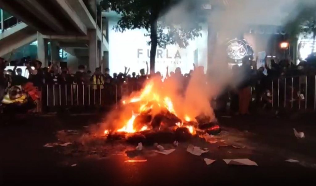 ขณะที่ตำรวจ สน. ปทุมวัน และ สน.ลุมพินีได้แจ้งต่อผู้ชุมนุม ว่าการชุมนุมดังกล่าวเป็นการเป็นการฝ่าฝืน พ.ร.ก.ฉุกเฉิน และประกาศของกทม. ขอให้มีการยุติการชุมนุม จนกระทั่ง เวลา 19.25 น. กลุ่มผู้ทำกิจกรรมนำหุ่นฟางที่แขวนไว้บริเวณสะพานลอยด้านข้างห้างสรรพสินค้าเซ็นทรัลเวิลด์ ลงมาจุดไฟเผาบนถนนราชดำริ ล่าสุด แกนนำประกาศยุติการชุมนุมตามเวลานัดหมายในเวลา 20.00 น. ก่อนที่ผู้ชุมนุม จะแยกย้ายเดินทางกลับบ้าน.-สำนักข่าวไทย