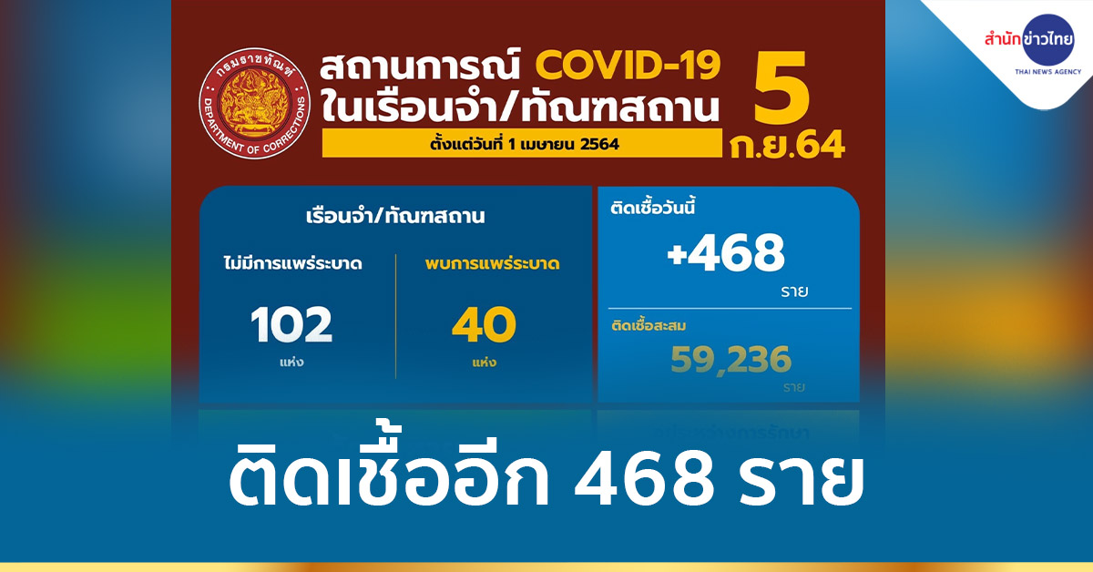 กทม. 5 ก.ย.-กรมราชทัณฑ์ รายงานสถานการณ์โควิด-19 วันนี้ พบติดเชื้อใหม่ 468 ราย ขณะที่เรือนจำจังหวัดปทุมธานี พ้นจากการระบาดเพิ่ม 1 แห่ง