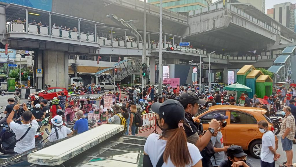 บรรยากาศการชุมนุมที่บริเวณแยกอโศกของ เครือข่าย “ไล่ประยุทธ์” ภายใต้สโลแกน สู้ด้วยกัน ไล่ด้วยกัน ที่นำโดยนายณัฐวุฒิ ใสยเกื้อ แกนนำนปช. และนายสมบัติ บุญงามอนงค์ หรือ บก.ลายจุด พร้อมแนวร่วมกลุ่มต่างๆ เช่น กลุ่มวีโว่ กลุ่มทะลุฟ้า กลุ่มนักเรียนเลว มีมวลชนทยอยเดินทางมาบริเวณแยกอโศกมนตรีตั้งแต่เวลา ประมาณ 15.00 น. โดยเริ่มทำกิจกรรมบนถนนอโศกฯ พร้อมตั้งเวทีเคลื่อนที่ ตั้งร้านจำหน่ายสินค้าและอาหารตลอดแนว โดยมีเจ้าหน้าที่ตำรวจ สน.ทองหล่อ มาคอยดูแลความเรียบร้อยและอำนวยความสะดวกให้กับประชาชน พร้อมนำแผงรั้วเหล็กมาปิดแยกอโศกฯ ฝั่งถนนอโศกฯ มุ่งหน้าแยกเพชรบุรี ตั้งแต่เวลา 15.45 น. ไม่ให้รถสัญจรผ่านเข้าออก ส่วนถนนอโศกฯ มุ่งหน้าคลองเตย และถนนสุขุมวิท ยังสามารถใช้งานได้ตามปกติ