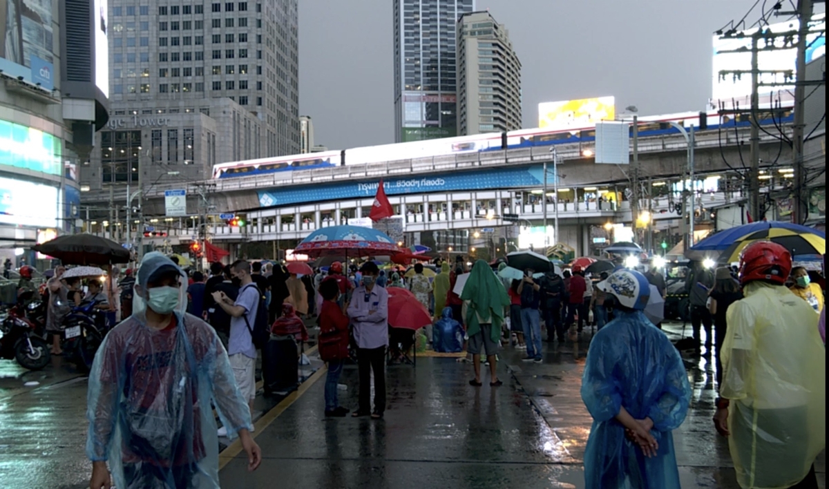 กระทั่งเวลาประมาณ 18.00 น. ฝนเริ่มโปรยปรายลงมา ขบวนคาร์ม็อบที่นำโดยนายณัฐวุฒิ ซึ่งขับวนอยู่บริเวณราชประสงค์ และย่านอโศก ได้นำขบวนมาหยุดสมทบที่แยกอโศก และเป็นช่วงเวลาที่ฝนเริ่มตกหนักขึ้น ทำให้ผู้ชุมนุมบางส่วนต้องหลบเข้าฟุตปาธ 2 ข้างถนนอโศก แต่เพียงครู่เดียวฝนก็หยุด ซึ่งเป็นช่วงจังหวะคนที่มาจากคาร์ม็อบขึ้นเวทีปราศรัย จากนั้นฝนก็ตกหนักอีกครั้ง แต่การปราศรัยยังคงดำเนินไปท่ามกลางสายฝน