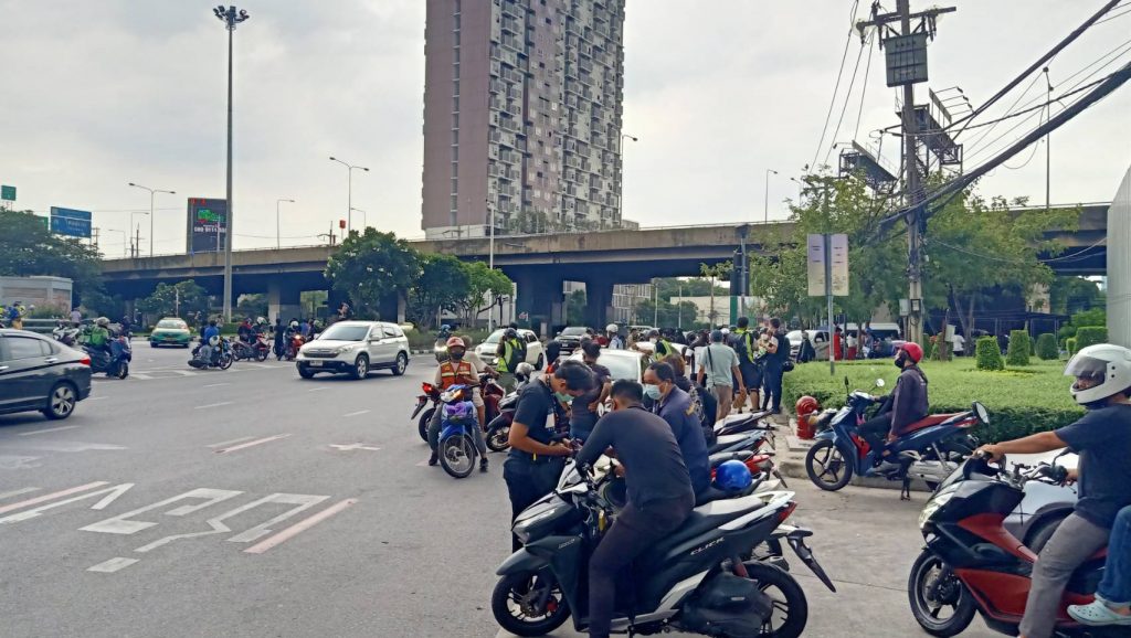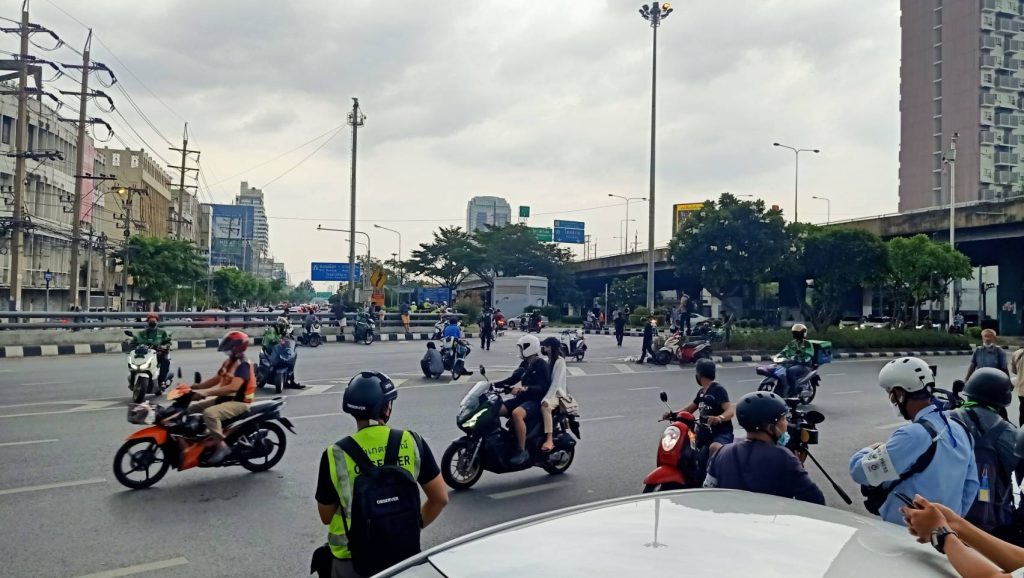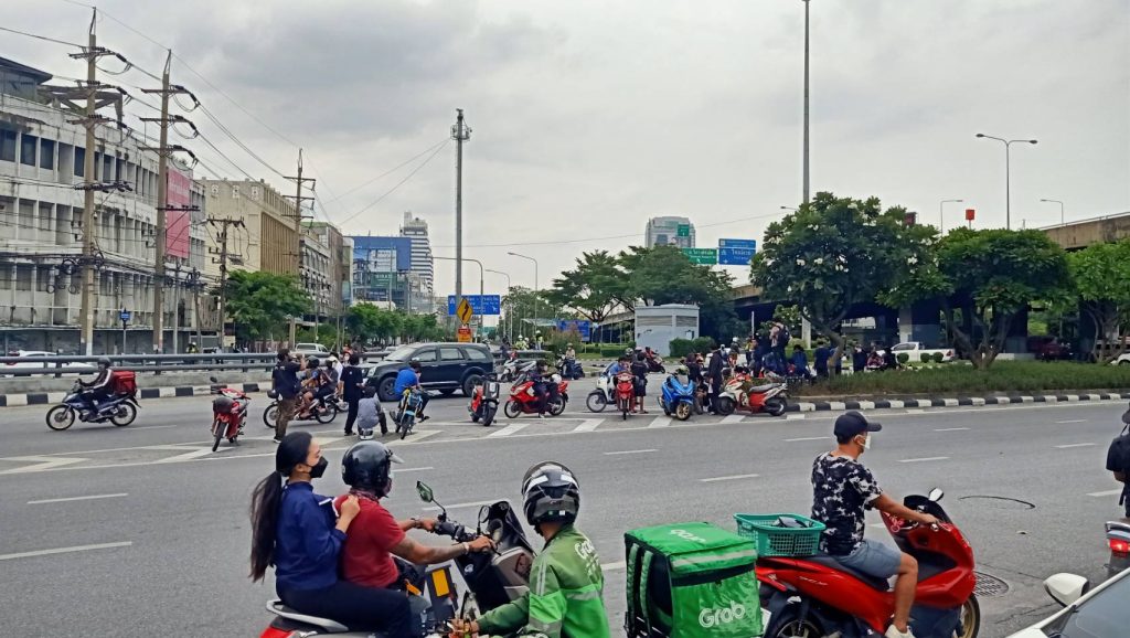 บรรยากาศ การชุมนุมของกลุ่มทะลุแก๊สที่แยกสามเหลี่ยมดินแดง เวลา 17.30 น. กลุ่มผู้ชุมนุมเริ่มทยอยเดินทางมาตามเวลานัดหมาย ผ่านเพจ “เยาวรุ่นทะลุแก้ส” ซึ่งระบุว่าวันนี้จะเป็นภารกิจเอาคืน หลังเมื่อวานนี้ บริเวณแยกสามเหลี่ยมดินแดง เกิดการปะทะกันระหว่างผู้ชุมนุมกับตำรวจควบคุมฝูงชน ตั้งแต่ช่วงค่ำยาวไปจนเวลาประมาณเที่ยงคืน โดยผู้ชุมนุมวันนี้ส่วนใหญ่ยังคงเป็นกลุ่มวัยรุ่นใช้รถจักรยานยนต์เป็นยานพาหนะ รวมตัวกันโดยไม่มีแกนนำ